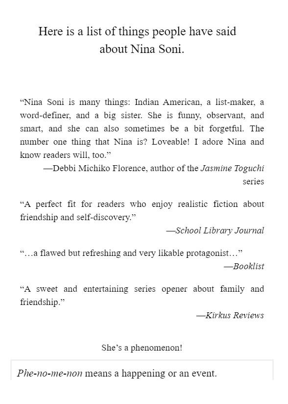 Nina Soni is a lovable, distractible Indian American girl with big plans and cast of family and friends to help her make her realize her dreams—or resolve the chaos that often results.