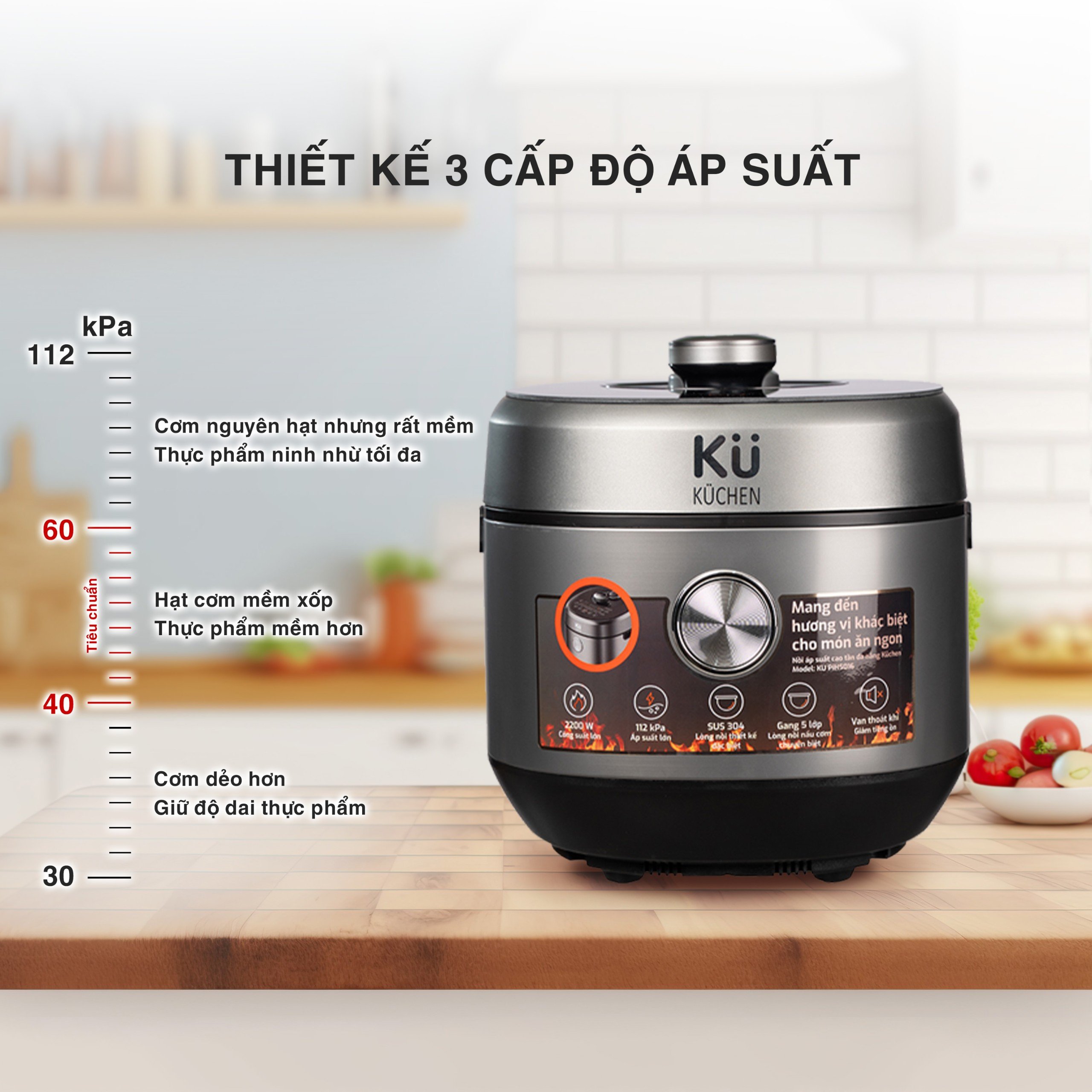 – Cấp độ 60-112 kPa: Ở cấp độ này, cơm sẽ rất mềm, nhưng hạt gạo vẫn được giữ nguyên hình, không bung nở. Thực phẩm sẽ được ninh nhừ 1 cách tối đa. Với cấp độ này sẽ phù hợp với các món ninh hầm. Thời gian chế biến nhanh từ đó giúp cho dinh dưỡng không bị mất đi.