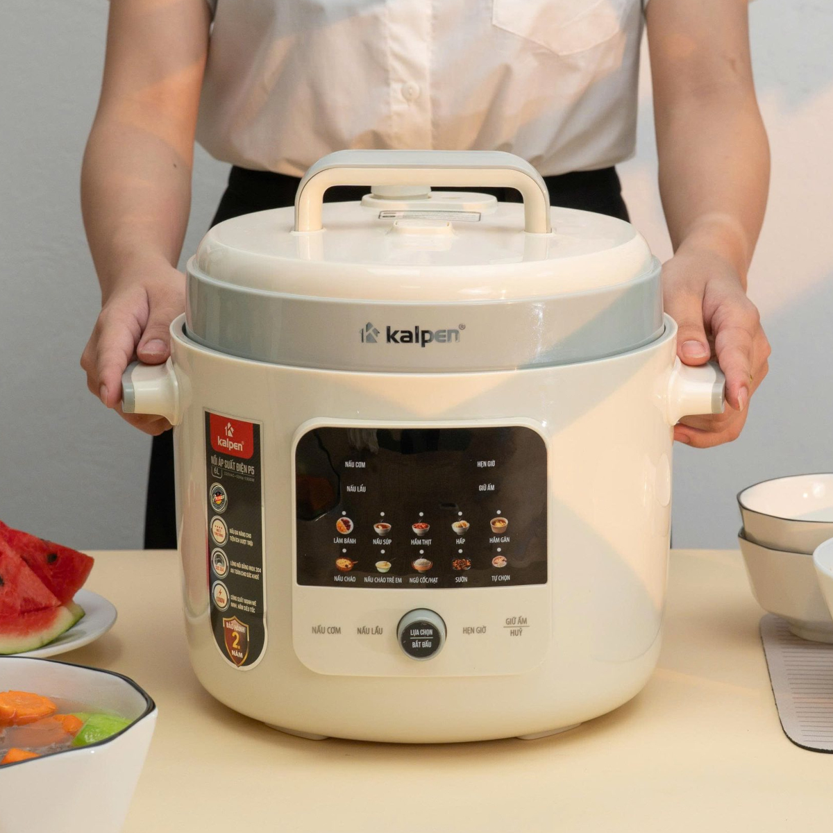 - Van an toàn kép Van xả áp tự động kích hoạt khi áp suất bên trong vượt ngưỡng, đóng vai trò như một lớp bảo vệ. Đây là chi tiết nhỏ nhưng vô cùng quan trọng đối với một chiếc nồi áp suất điện hiện đại như nồi áp suất Kalpen P5 Nhiều chế độ nấu tự động thông minh Nồi áp suất điện Kalpen P5 tích hợp nhiều chế độ nấu cài đặt sẵn như: Hầm xương, nấu cháo, nấu canh, kho thịt, hấp, giữ ấm… Tất cả chỉ cần một lần nhấn nút – tiết kiệm thời gian và công sức cho người nội trợ.