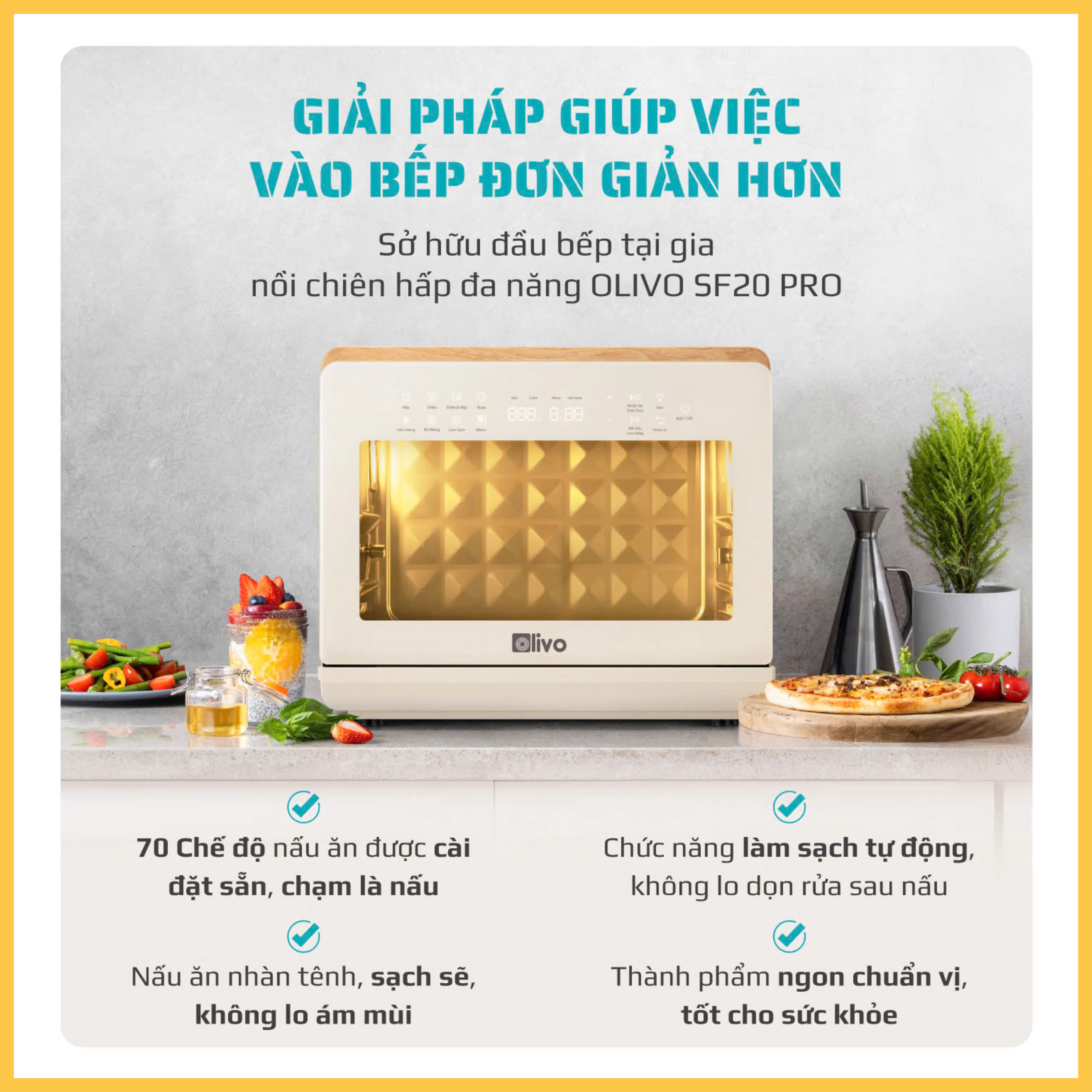 - Chức năng hầm: Ở mức nhiệt từ 60-125 độ C, nồi Olivo SF20 Pro có thể thay thế nồi áp suất cơ để hầm thịt heo, thịt bò, gà, vịt, sườn vừa nhanh gọn vừa mềm ẩm. Tích hợp 70 chương trình nấu tự động Nồi chiên hơi nước Olivo SF20 Pro có đến 70 chương trình nấu tự động, bao gồm cả những món ăn đậm chất Việt như thịt kho tàu, cá kho tộ, nem rán, chả lá lốt… giúp bạn dễ dàng chế biến mà không cần nhớ công thức. Các chương trình này đã được setup sẵn nhiệt độ, thời gian phù hợp cho từng nguyên liệu. Bạn chỉ cần chọn chế độ là nồi thực hiện chu trình. Công suất mạnh mẽ 2.800W Với công suất lên đến 2.800W, nồi Olivo SF20 Pro sẽ giúp bạn chế biến món ăn nhanh chóng, tiết kiệm thời gian. Dải nhiệt độ hoạt động của nồi rộng, từ 40 - 230 độ C giúp thay thế 10 thiết bị nhà bếp như nồi áp suất cơ, lò vi sóng, nồi cơm điện, nồi chiên không dầu, lò nướng, máy ủ sữa chua, máy sấy hoa quả, máy tiệt trùng... Nhờ đó, chỉ với một chiếc nồi Olivo SF20 Pro, bạn sẽ tiết kiệm chi phí mua đồ gia dụng bếp, nấu nướng tiết kiệm thời gian và có trải nghiệm tốt hơn. Tích hợp chức năng tự làm sạch giúp vệ sinh nồi dễ dàng Nồi Olivo SF20 Pro được tích hợp chức năng làm sạch hiện đại giúp việc vệ sinh nồi trở nên đơn giản, nhẹ nhàng hơn. Bạn có thể kích hoạt chức năng này bằng cách nhấn nút Làm sạch trên bảng điều khiển, nồi chiên sẽ tận dụng hơi nước ở nhiệt độ cao để làm giảm độ bám của các vết bẩn cứng đầu như dầu mỡ, cặn cháy... trên thành nồi. Nhờ đó, sau khi kết thúc chương trình, bạn chỉ cần dùng khăn mềm lau sạch lại là được. Bảng điều khiển cảm ứng trực quan, dễ nhìn Nồi chiên hấp đa năng Olivo SF20 Pro được trang bị bảng điều khiển điện tử với các nút cảm ứng siêu nhạy, cho bạn thực hiện thao tác mượt mà, trơn tru. Các nút chức năng được minh họa bằng các "icon" dễ hiểu, dễ nhìn, bên dưới còn có chú thích bằng tiếng Việt, giúp bạn cài đặt chính xác ngay từ lần đầu sử dụng. Không chỉ vậy, trên bảng điều khiển còn có màn hình LED hiển thị các thông số quan trọng để bạn thuận tiện theo dõi, quan sát. Đa dạng phụ kiện đi kèm Nồi chiên hơi nước Olivo SF20 Pro được trang bị đầy đủ phụ kiện giúp bạn thuận tiện sử dụng, bao gồm: