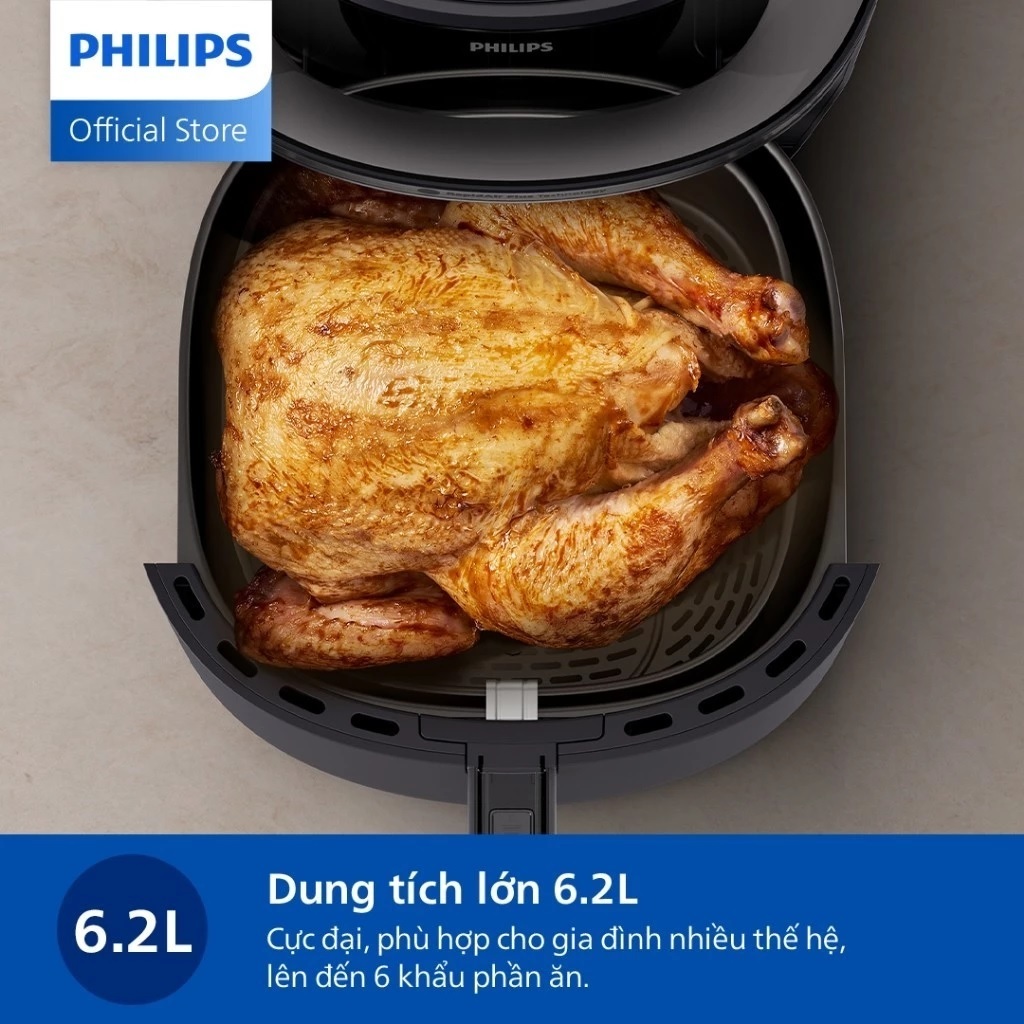 Nồi chiên không dầu Philips NA332/00 – Dung tích 6.2L, 10 chế độ nấu tự động ƯU ĐIỂM NỔI BẬT - Dung tích 6.2L rộng rãi Chiên gà nguyên con ~1.5kg hoặc nướng cùng lúc