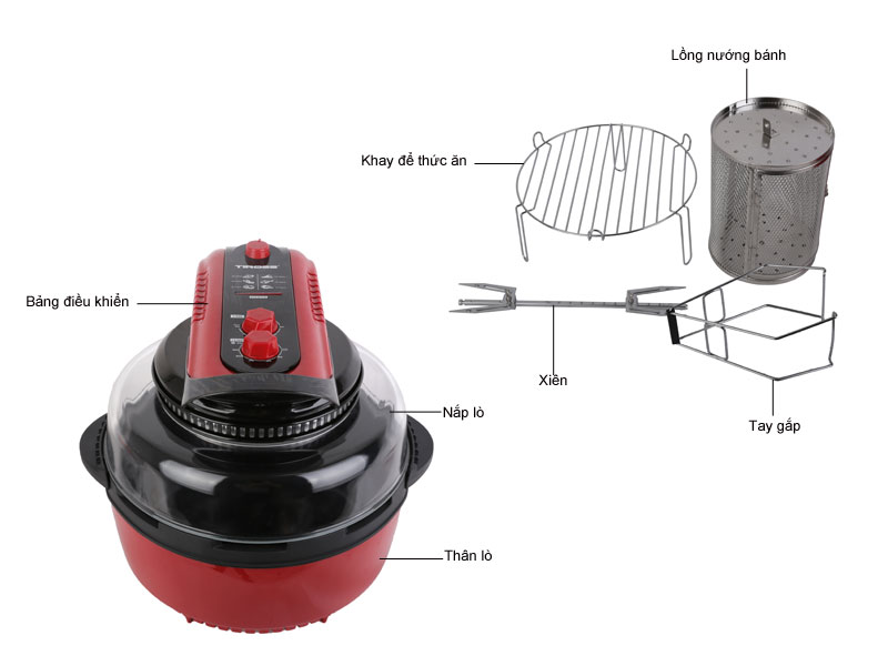 Nồi Chiên Không Khí Đa Năng Tiross TS903 - 11L (Đỏ Đen) sở hữu thiết kế tiện lợi với nhiều phụ kiện đa năng đính kèm như lồng chiên, trục xiên 360 độ, giá đỡ thực phẩm, giúp bạn nấu chín thực phẩm theo nhiều cách khác nhau mà vẫn đảm bảo thức ăn thơm ngon.