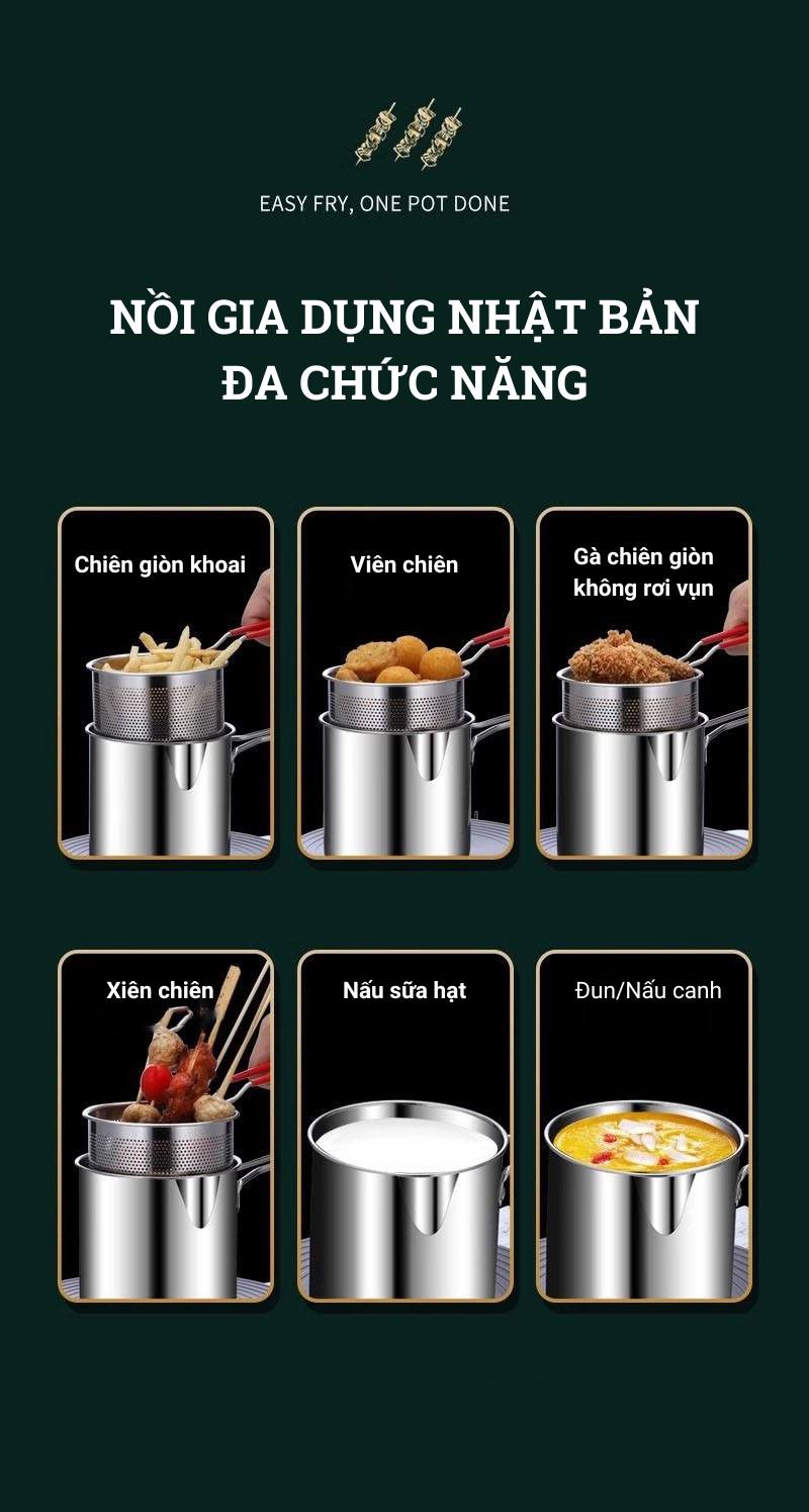 Nồi chiên ngập dầu inox 304 nồi chiên mini tiết kiệm dầu tempura kiểu Nhật nồi chiên nhỏ có bộ lọc Chất liệu: làm bằng thép không gỉ chất lượng cao. Đa chức năng: chảo sốt có thể được rang, ướp lạnh và hấp. Phù hợp với các loại bếp: Bếp gas, bếp từ, bếp hồng ngoại, bếp điện.