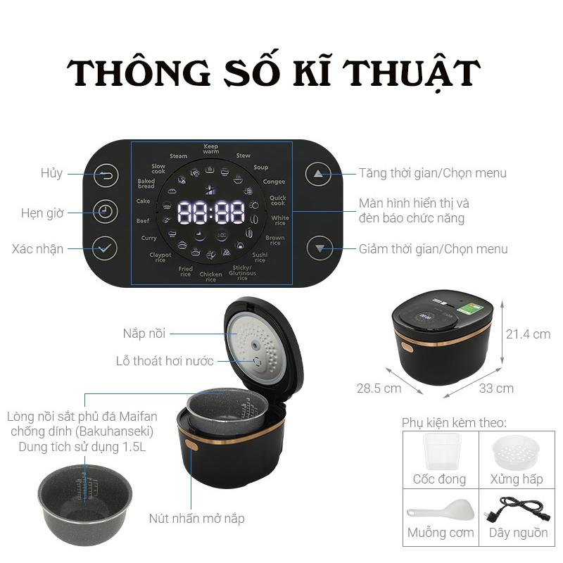 Tiện ích: Có xửng hấpGiữ ấm 24 giờHẹn giờ 24 giờ