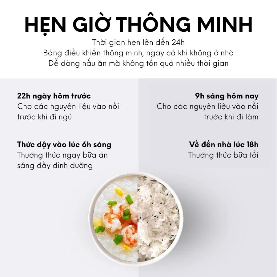 ️ Hẹn giờ lên đến 24 tiếng, với khóa an toàn ️ Chất liệu: + Cốc đong gạo, muỗng múc cơm, xửng hấp bằng chất liệu nhựa PP an toàn khi tiếp xúc thực phẩm