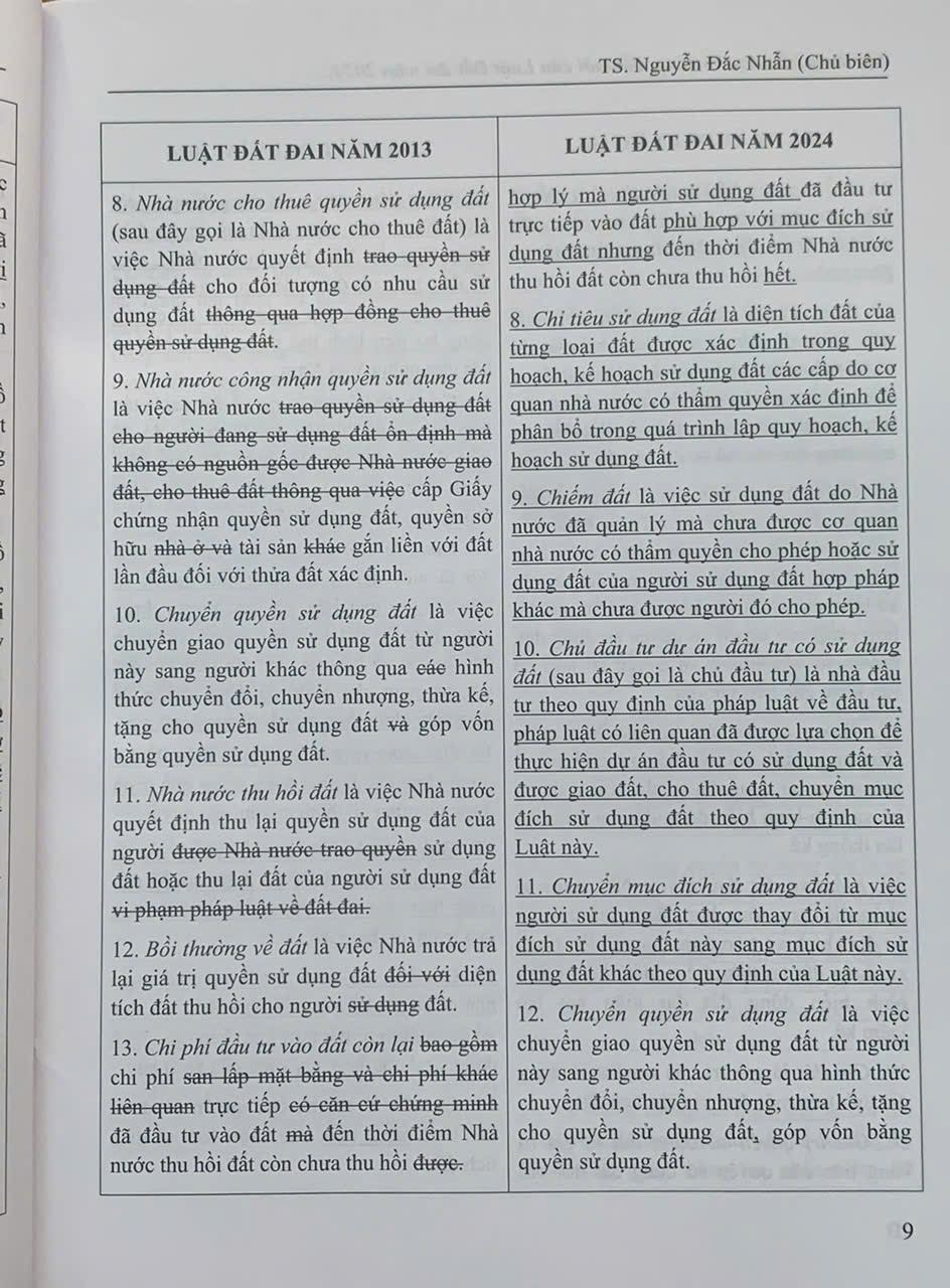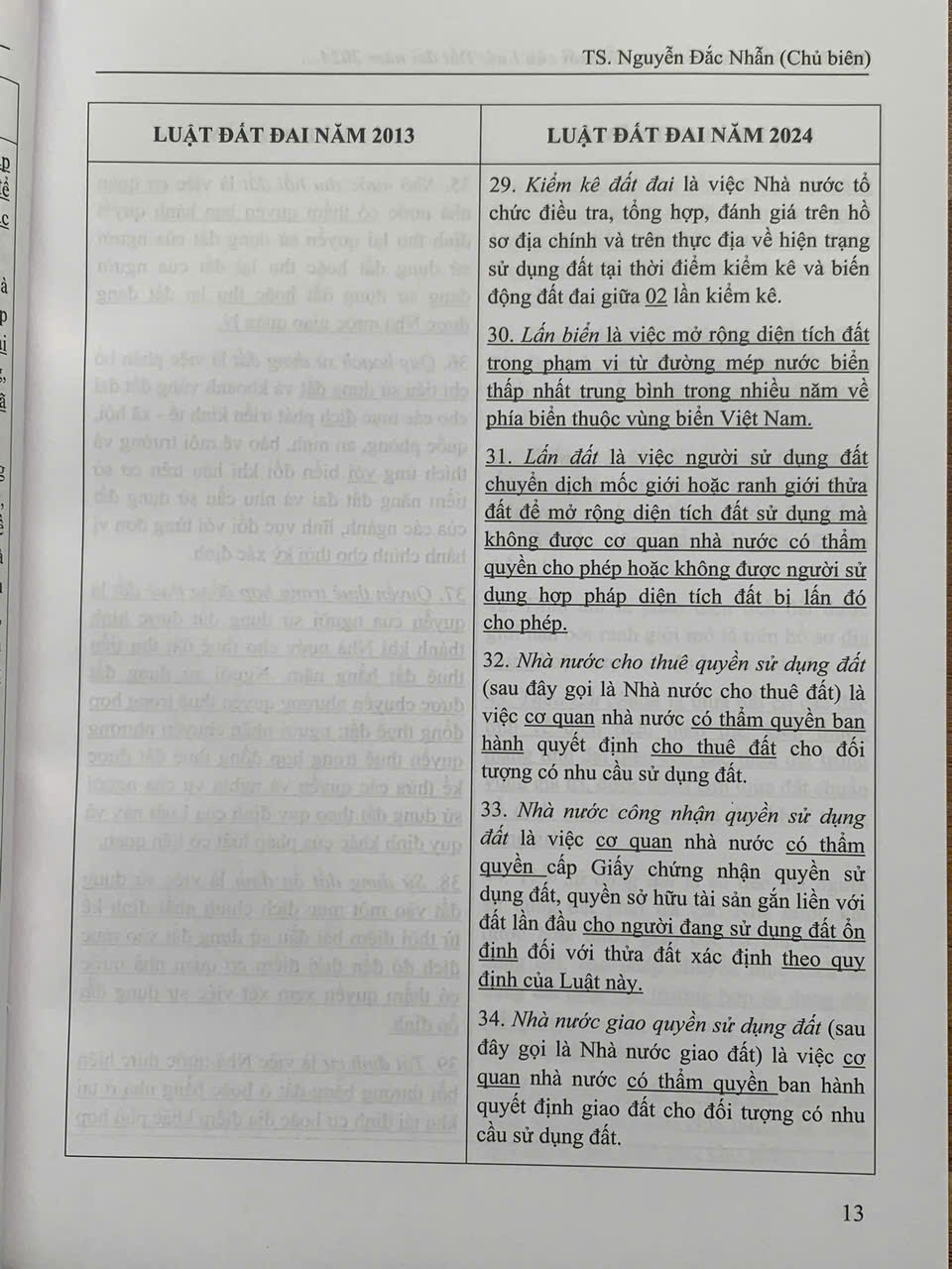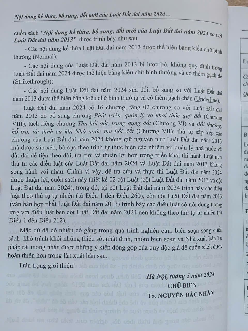 Để thuận tiện trong quá trình theo dõi, nghiên cứu, triển khai thi hành Luật, cuốn sách “Nội dung kế thừa, bổ sung, đổi mới của Luật Đất đai năm 2024 so với Luật Đất đai năm 2013” được trình bày như sau:
