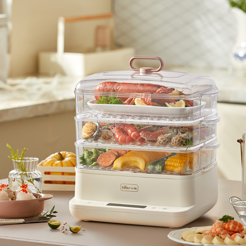 - Thiết kế đa tầng: Nồi hấp Bear EFS-4H27E thường có nhiều tầng hấp (phổ biến là 2 hoặc 3 tầng), cho phép bạn hấp cùng lúc nhiều loại thực phẩm khác nhau (ví dụ: