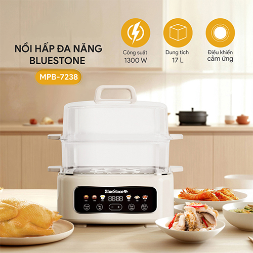Nồi hấp đa năng Bluestone MPB-7238 Công suất : 1300W Dung tích : 17 Lít Điều khiển : Cảm ứng Tiếng Việt Số tầng hấp : 2 tầng Chất liệu : Nhựa, inox 304 Đa