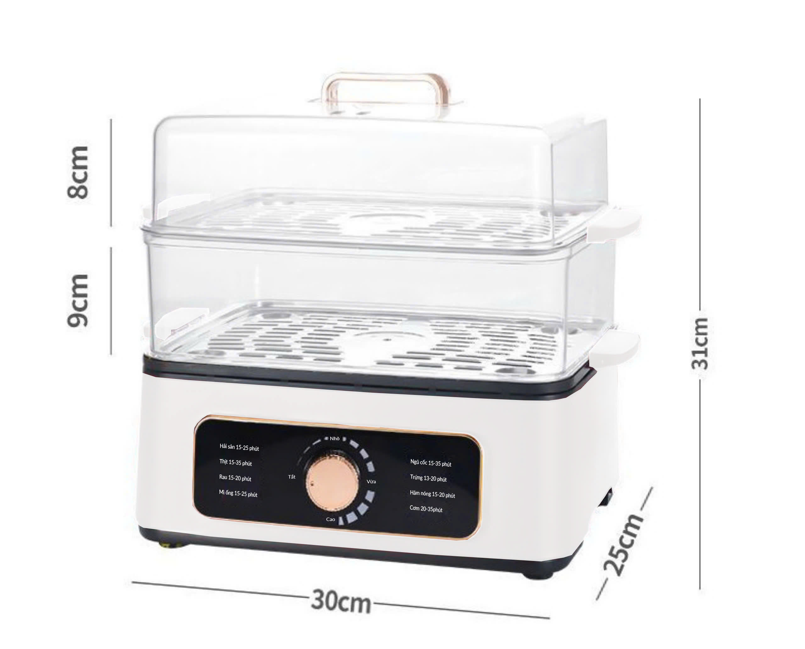 THÔNG SỐ KỸ THUẬT - Điện áp: 220V - 50Hz - Công suất: 800W - Dung tích: 18L ( 3 tầng) - Thiết kế tầng hấp: 3 tầng có thể tháo