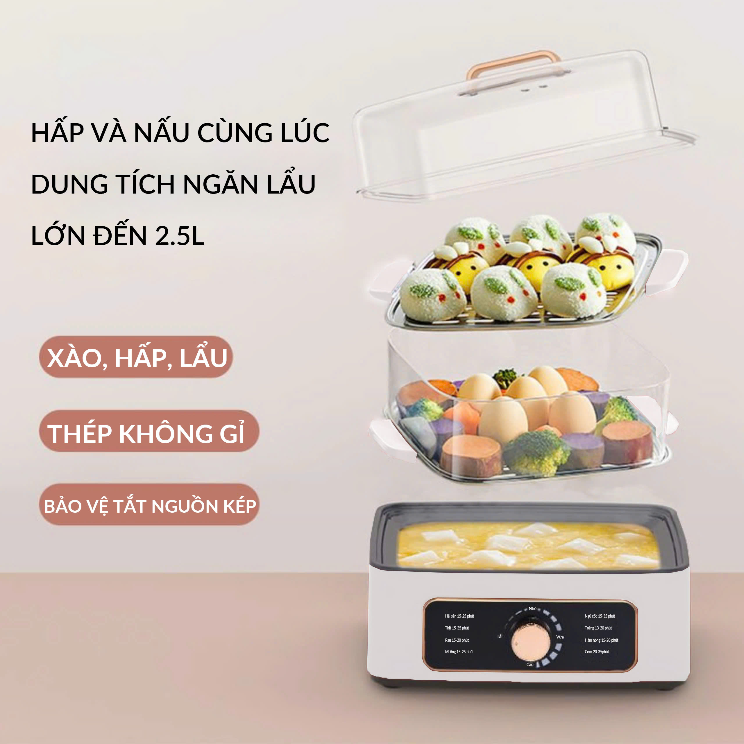 - Trên hấp, dưới nấu cháo hầm xương tích hợp