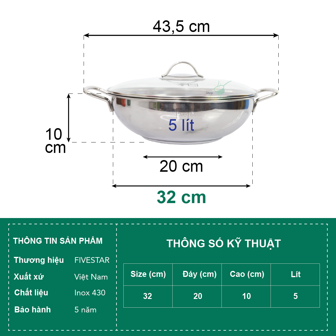 Chảo Inox 304 Fivestar size 32cm 3 đáy vung kính - Lẩu, xào, rán đủ kiểu - Bảo hành 5 năm 0986588655