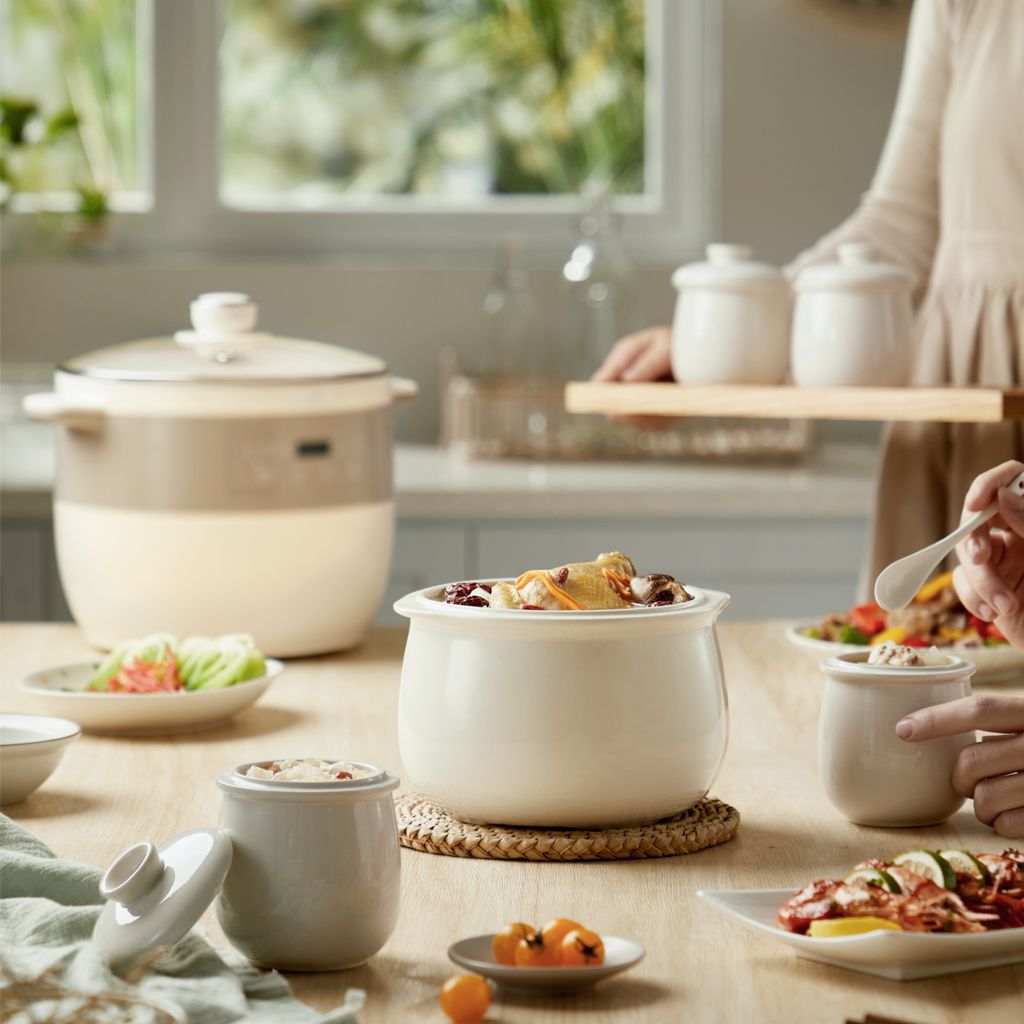 Cải tiến so với nhiều dòng nồi nấu chậm trước đó, Nồi nấu chậm đa năng DDZ-B25Q3 được Bear trang bị không chỉ 1 mà đến 5 thố sứ: 01 thố sứ lớn 2,5 lít và 04 thố sứ nhỏ dung tích 400ml. Với trang bị này, bạn có thể tiết kiệm thời gian nấu cháo, nấu chè hay hầm xương cùng lúc rất tiện lợi. Chất liệu gốm sứ Quảng Đông cao cấp đảm bảo an toàn sức khỏe cho người dùng.