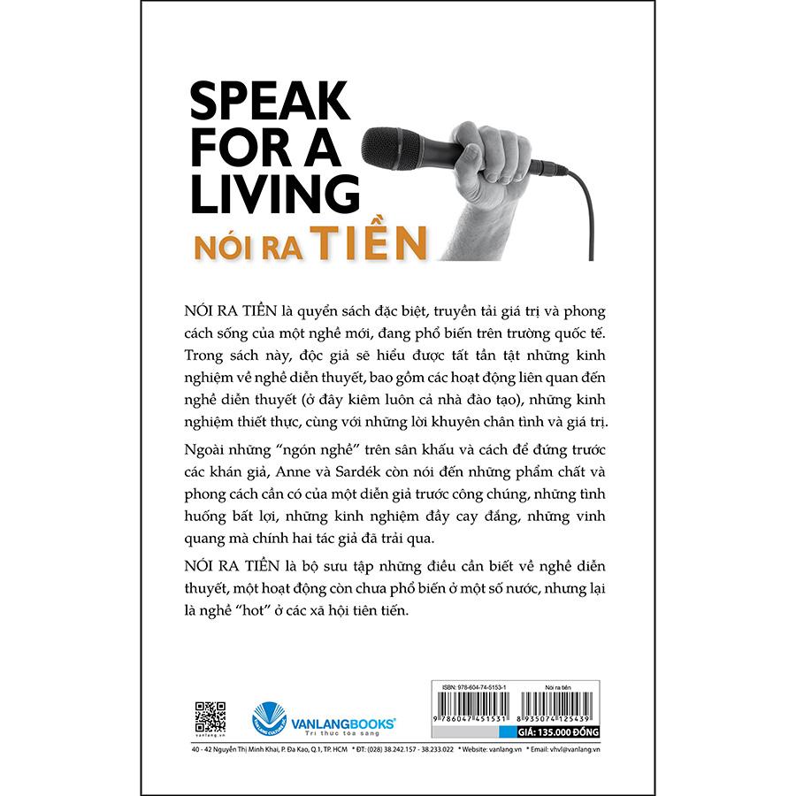 NÓI RA TIỀN là quyển sách đặc biệt, truyền tải giá trị và phong cách sống của một nghề mới, đang phổ biến trên trường quốc tế. Trong sách này, độc giả sẽ hiểu được tất tần tật những kinh nghiệm về nghề diễn thuyết, bao gồm các hoạt động liên quan đến nghề diễn thuyết (ở đây kiêm luôn cả nhà đào tạo), những kinh nghiệm thiết thực, cùng với những lời khuyên chân tình và giá trị.