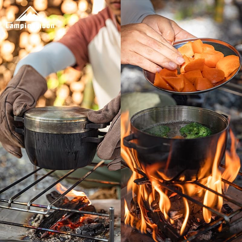 Nồi treo dã ngoại inox không rỉ Campingmoon là một giải pháp tiết kiệm: nồi có nắp chắc chắn và nặng có thể đặt lên trên dụng cụ nấu để sử dụng ngoài trời. Bạn có thể thoải mái nấu nhiều món ăn khác nhau chỉ với một chiếc nồi này, chẳng hạn như nấu trong lò với khả năng giữ nhiệt và giữ nhiệt cao.