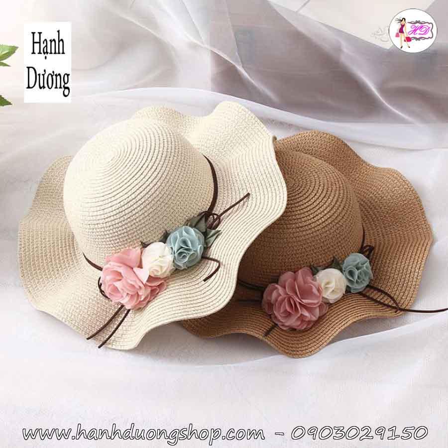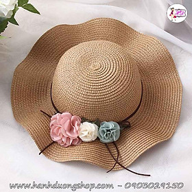 ✨Nón cói đi biển trẻ em vành gợn sóng, gắn nơ 3 hoa vải thời trang dành cho bé từ 3 đến 7 tuổi, có dây quai nón - Hạnh Dương