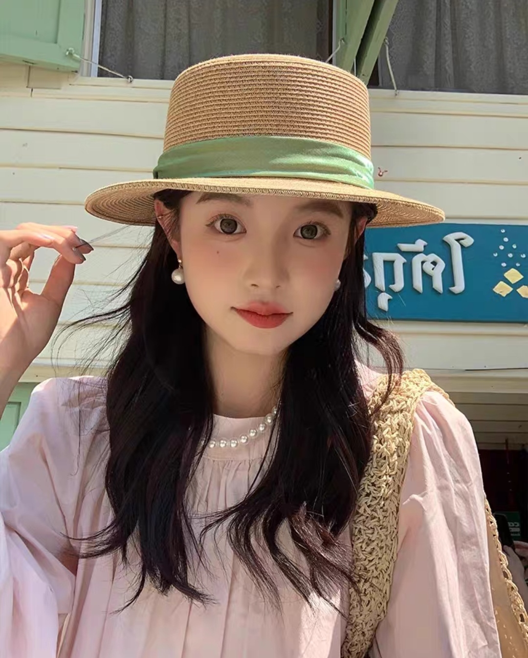 Mũ cói rơm vành phẳng nữ mùa hè phiên bản Hàn Quốc chống nắng UV cho kỳ nghỉ Nón đi biển Paris thời trang hàng đầu Pháp Chất liệu cói