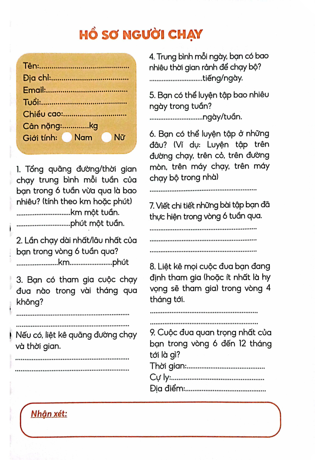 Cuốn sổ tay được thiết kế vô cùng độc đáo và khoa học, giúp người đọc xây dựng một kế hoạch chạy bộ xuyên suốt 365 ngày, theo dõi tiến bộ, ghi lại nhật trình hoạt động như vị trí, thời gian, thời tiết và quãng đường chạy, nắm rõ tình trạng sức khỏe để tránh dẫn đến kiệt sức. Đồng thời, cuốn sổ còn đưa ra những bí quyết để tối ưu hóa hiệu suất, duy trì thể lực tối đa và giữ vững thói quen chạy bộ đều đặn mà không kiệt sức và chán nản.