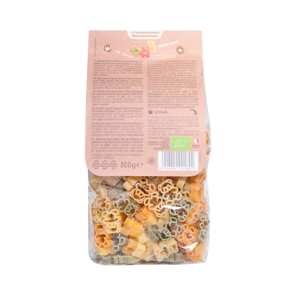 Mặt khác, với thành phần tuyển chọn mì ống làm từ bột lúa mì cứng chất lượng cao của Ý và được bổ sung thêm các loại rau hữu cơ khử nước như cà chua và rau bina Cung cấp thêm cho bé nguồn vitamin A, vitamin C, Vitamin K. vitamin B1, tăng cường hệ miễn dịch và giúp xương chắc khỏe.