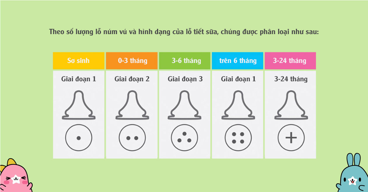 - Chia 5 giai đoạn theo quá trình phát triển của bé: Lỗ tiết được chia thành năm giai đoạn theo lượng sữa của từng tuổi.