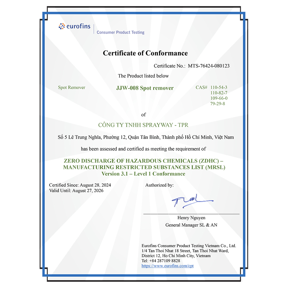 NƯỚC TẨY BẨN QUẦN ÁO THÂN THIỆN MÔI TRƯỜNG Được sản xuất với công nghệ tiên tiến với khả năng tẩy hiệu quả cao, là trợ thủ đắc lực cho các nhà máy may mặc, sản phẩm có khả năng tẩy sạch các vết bẩn trên nhiều loại vải, da, len,.. Được cấp chứng nhận ZDHC MRSL V3.1 7 ĐẶC TÍNH JJW-008: Dạng lỏng Màu trong suốt Mùi hương nhẹ Sản phẩm thân thiện với môi trường Hiệu quả tức thì Tẩy sạch sẽ không để lại dấu vết Giá thành hợp lý Hiệu quả tốt khi kết hợp với súng phun