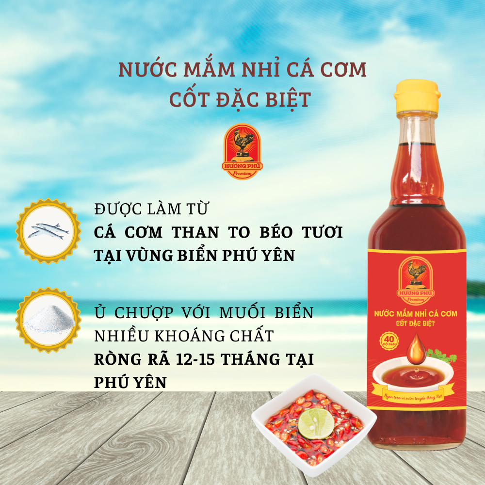 Với 100% cá cơm tươi, béo ú được chọn lựa kỹ được kết hợp với muối tinh khuyết được ủ bằng phương pháp truyền thống trong thùng gỗ được lên men tự nhiên, sau 18 đến 24 tháng những dòng nước cốt nguyên chất, không pha được rút, nhỉ ra từng giọt mắm màu cánh gián đẹp mắt, đậm đà, hậu vị được đóng chai tạo nên Nước mắm nhỉ cá cơm cốt đặc biệt HƯƠNG PHÚ 40 độ đạm.