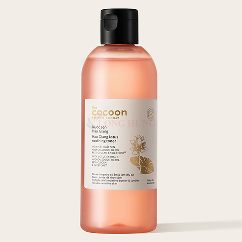 Nước sen Hậu Giang Cocoon Lotus Soothing Toner Thành phần:  Chiết xuất sen: có tác dụng hạn chế các gốc tự do sinh ra bởi tia UV và các căng thẳng từ môi trường, giúp giữ ẩm cao, hỗ trợ làm mềm và làm dịu làn da nhạy cảm.  Beta-glucan (prebiotic): Cân bằng hệ sinh vật trên da, tăng khả năng tự bảo vệ của da, hỗ trợ quá trình phục hồi da.  Madecassoside: Chiết xuất từ rau má, có tác dụng hỗ trợ làm lành da, cấp ẩm và tăng sinh collagen  Vitamin B12: Giúp vệ hàng rào độ ẩm, làm dịu làn da nhạy cảm, giảm mẩm đỏ và ngứa do khô ráp hoặc do thời tiết.  Sweetone: Hoạt chất được chiết xuất từ quả ngũ vị tử hữu cơ, rất giàu peptide giúp làm dịu và giúp da trở nên đều màu. Công dụng:  Bảo vệ hàng rào độ ẩm  Phục hồi, cấp ẩm và làm dịu da  Cân bằng hệ vi sinh vật trên da Phù hợp cho da:  Da nhạy cảm tới rất nhạy cảm  Da thường tới da khô và da dầu mụn  Da bị mẩn đỏ và ngứa do khô ráp hoặc do thời tiết  Da tổn thương cần được phục hồi nhanh  Da treatment hoặc cần được phục hồi khi vừa trải qua liệu trình thẩm mỹ (xâm lấn hoặc không xâm lấn)  Phụ nữ mang thai Hướng dẫn sử dụng: