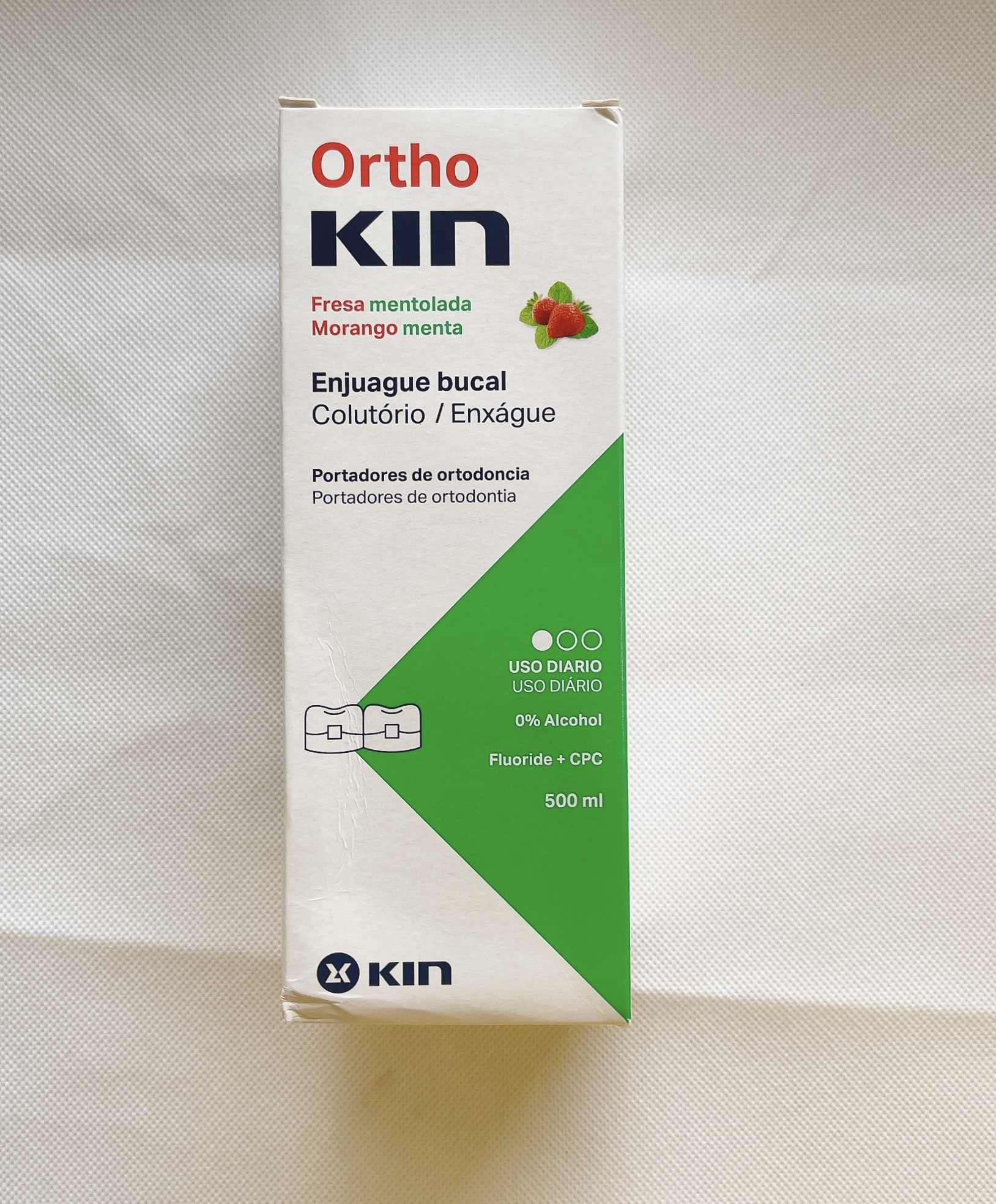 NƯỚC SÚC MIỆNG CHUYÊN DỤNG DÀNH CHO RĂNG CHỈNH NHA ORTHO KIN CHỨA FLUORIDE, CPC CÙNG CÁC KHOÁNG CHẤT BỔ SUNG CHO RĂNG VÀ NƯỚU CHẮC KHỎE CÙNG HƠI THỞ THƠM MÁT VỊ DÂU TÂY HÒA QUYỆN CÙNG HƯƠNG BẠC HÀ MÁT LẠNH CHO BẠN SỰ TỰ TIN TUYỆT ĐỐI DÙ ĐANG ĐEO MẮC CÀI.