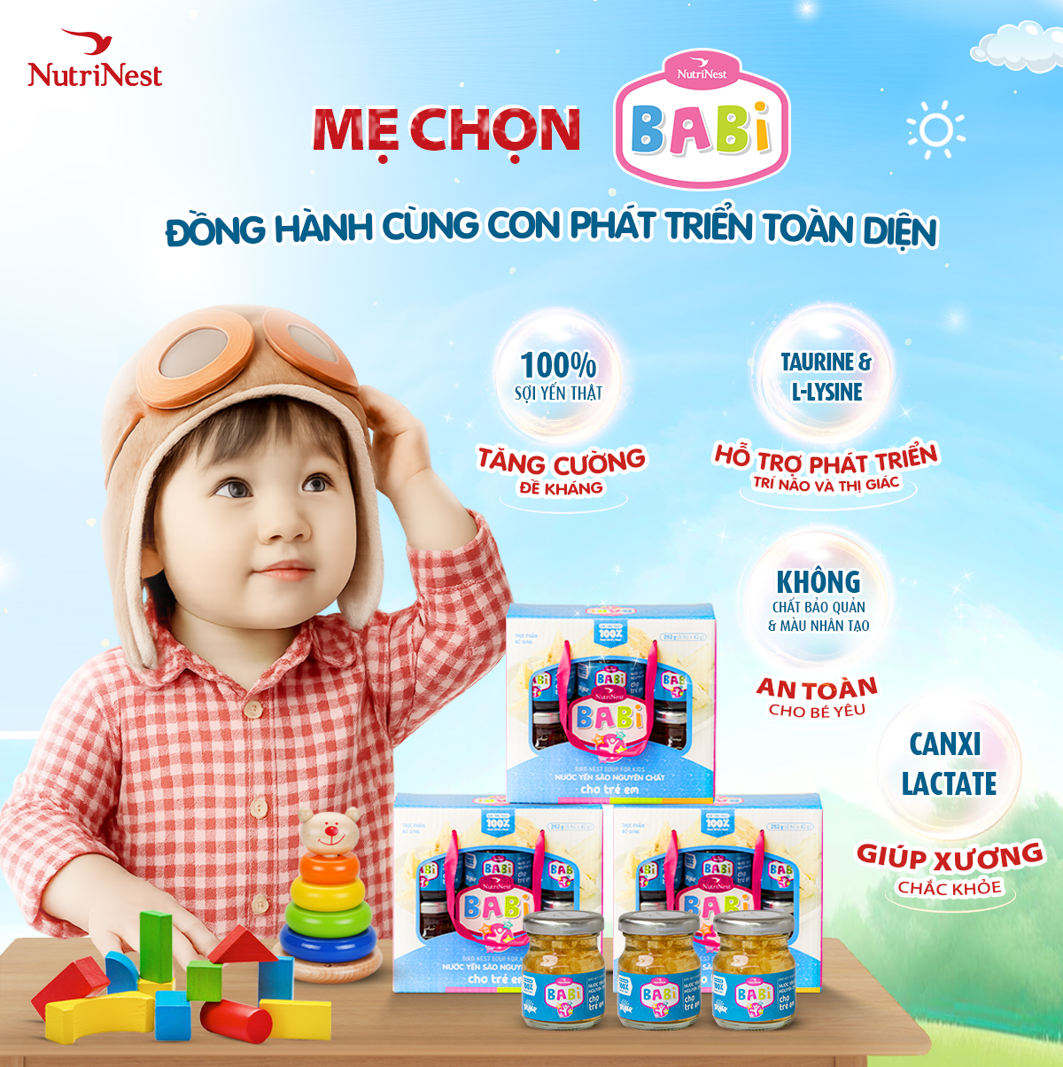 NutriNest Babi – sản phẩm nước yến cao cấp dành riêng cho trẻ em, với sợi yến mềm tự nhiên, vị ngọt thanh từ đường kiêng từ củ cải đường tự nhiên và hương Vani cao cấp chiết xuất từ hoa Vani tự nhiên. Được chưng theo phương pháp truyền thống kết hợp công nghệ hiện đại, NutriNest Babi giữ trọn hương vị tinh khiết và giá trị dinh dưỡng.  Thành phần  Yến sào khô: 0.6g/hũ (sau khi chưng tương đương 5g sợi yến thật), nước tinh khiết, đường phèn, Isomalt (chiết xuất từ củ cải), Canxi Lactate, L-Lysine, Taurine, Phụ gia thực phẩm an toàn (415, 331iii, 418), hương Vani tự nhiên  Không chất bảo quản, không màu nhân tạo.    Lợi ích, công dụng  Tăng cường sức đề kháng tự nhiên cho trẻ  Hỗ trợ hệ tiêu hóa, kích thích vị giác, giúp trẻ ăn ngon miệng  Bổ sung canxi, lysine, taurine – hỗ trợ phát triển xương khớp, chiều cao và trí não  Bồi bổ phổi, tăng cường hệ hô hấp  Giúp trẻ có nguồn năng lượng và dưỡng chất thiết yếu để phát triển toàn diện    Giới thiệu Công nghệ  NutriNest Babi được chưng theo công nghệ SpyderShake trong quy trình khép kín và tiệt trùng hiện đại, giúp cố định sợi yến khi gia nhiệt. Nhờ đó, sợi yến thật giữ nguyên cấu trúc với đặc trưng sợi không đều, màu ngả hổ phách sau nấu – dấu hiệu nhận biết yến thật. Công nghệ này đồng thời bảo đảm vệ sinh an toàn thực phẩm và tối ưu hóa bảo toàn dưỡng chất, hiệu quả vượt trội (đến gấp 10 lần). Đối tượng sử dụng  Trẻ em từ 9 tháng tuổi trở lên  Trẻ có sức đề kháng kém, biếng ăn, chậm lớn  Trẻ cần bổ sung dưỡng chất để phát triển thể chất và trí tuệ   Hướng dẫn sử dụng & bảo quản  Cách dùng:  Trẻ từ 9 tháng tuổi trở lên: 1–2 hũ/ngày Ngon hơn khi dùng lạnh  Bảo quản:  Nơi sạch sẽ, thoáng mát, tránh ánh nắng trực tiếp.   Đậy kín nắp sau khi mở.   HSD / Xuất xứ  Hạn sử dụng: 18 tháng kể từ ngày sản xuất  Xuất xứ: Việt Nam – Sản xuất bởi NutriNest  Dung tích & Quy cách đóng gói  Hũ đơn: 42g  Lốc 6 hũ x 42g/ hũ Lốc 8 hũ x 42g/hũ Thùng 24 hũ x42g/ hũ Thông tin Brand  NutriNest – Thương hiệu yến sào uy tín tại Việt Nam với 20 năm kinh nghiệm, tiên phong ứng dụng công nghệ hiện đại trong chưng yến, cam kết mang đến sản phẩm yến thật – dinh dưỡng thật cho mọi gia đình.