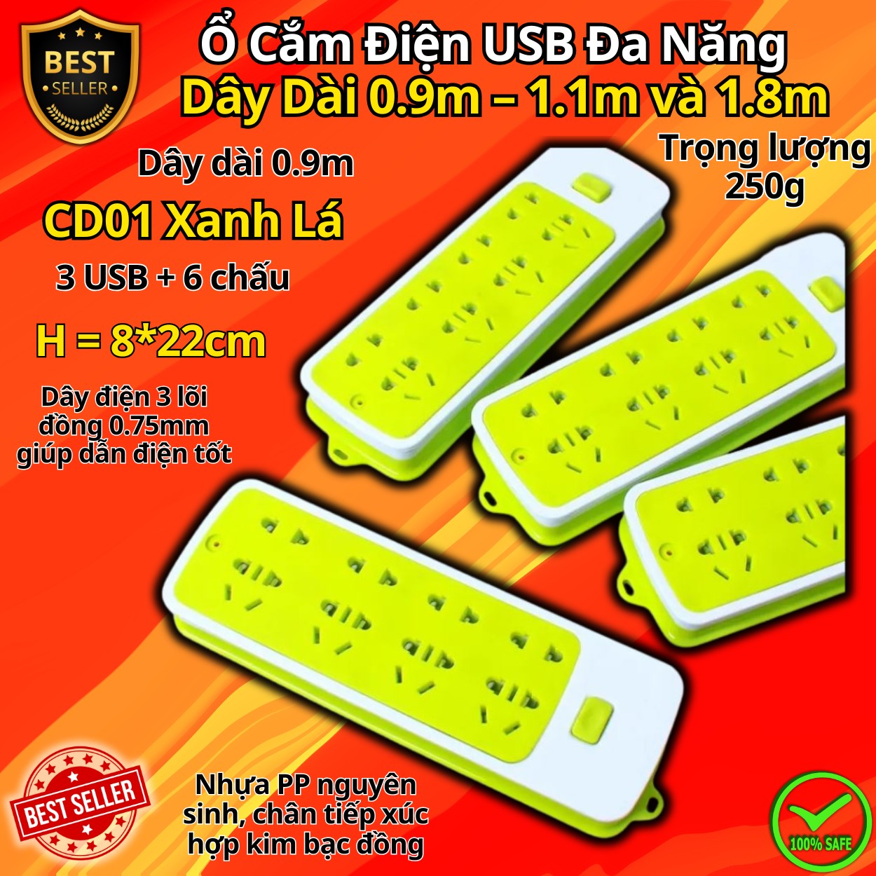Ổ Cắm Điện USB Đa Năng Cao Cấp Chống Giật Dây Dài 0.9m – 1.1m và 1.8m Ổ Cắm Điện Công Suất 2500W Có Chốt An Toàn Tiện Lợi, Chính Hãng   ✅ Mã ổ cắm CD01 – dây 0.9m – màu xanh lá ✅ Mã ổ cắm CD02 Trắng 7 màu – dây 1.8m ✅ Mã ổ cắm CD03 Trắng 6 chấu – dây 1.1m