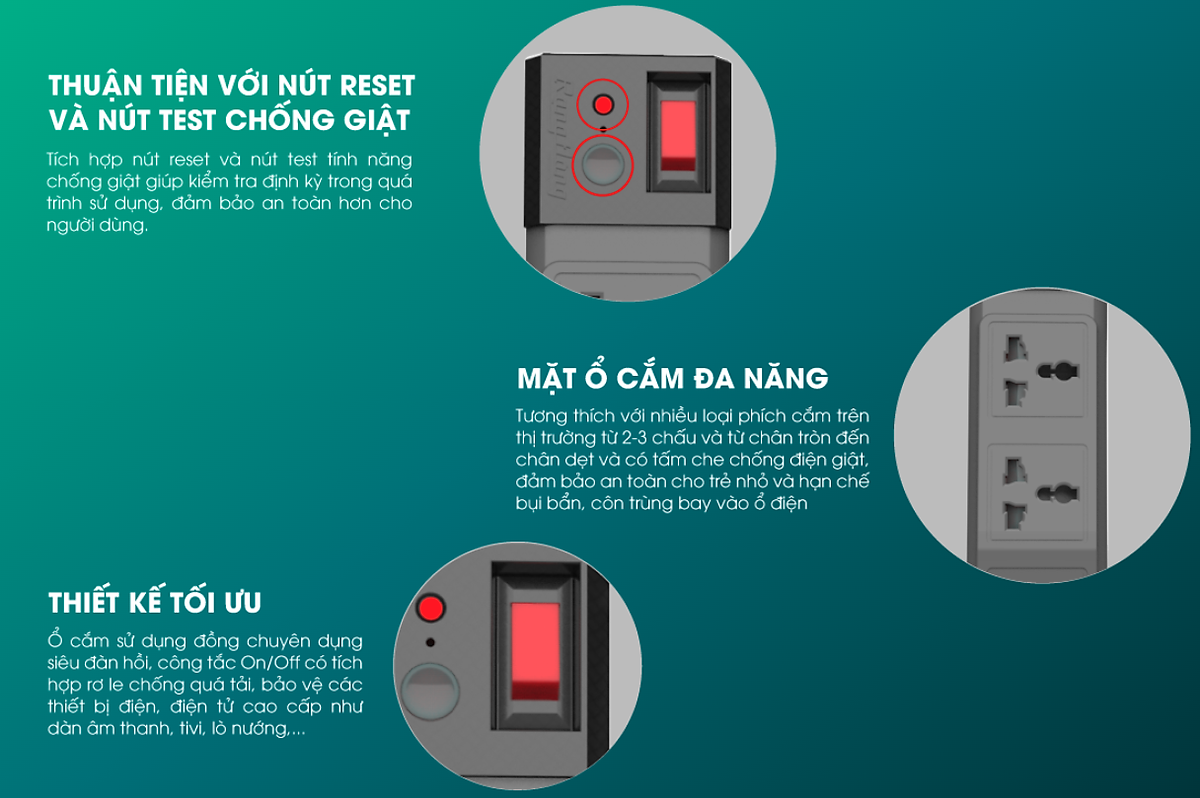 Ổ cắm nối dài đa năng cao cấp Dây dẫn ĐỒNG NGUYÊN CHẤT, ĐÚNG TIẾT DIỆN 100% Bảo vệ quá tải bằng công tắc tự động (MINI CB) Tiếp điểm sử dụng nguyên liệu đồng