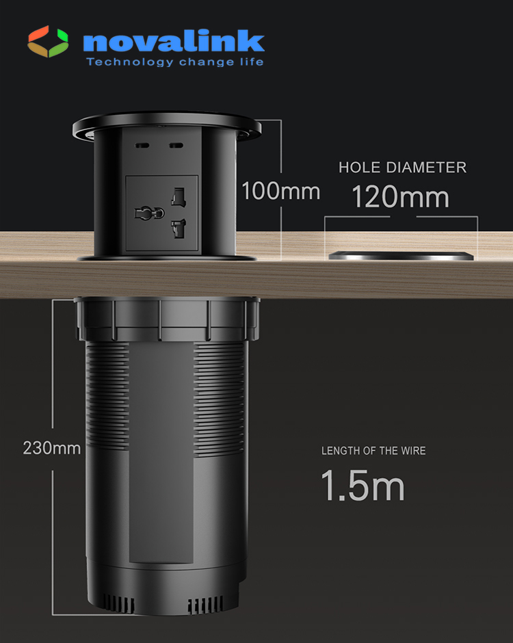Ổ điện Novalink KA-01 được thiết kế để có thể nâng lên và hạ xuống dễ dàng, giúp tiết kiệm không gian và giữ cho bề mặt làm việc luôn gọn gàng. Khi không sử dụng, bạn có thể đẩy ổ điện xuống dưới mặt bàn, tạo nên một không gian phẳng và không vướng víu.