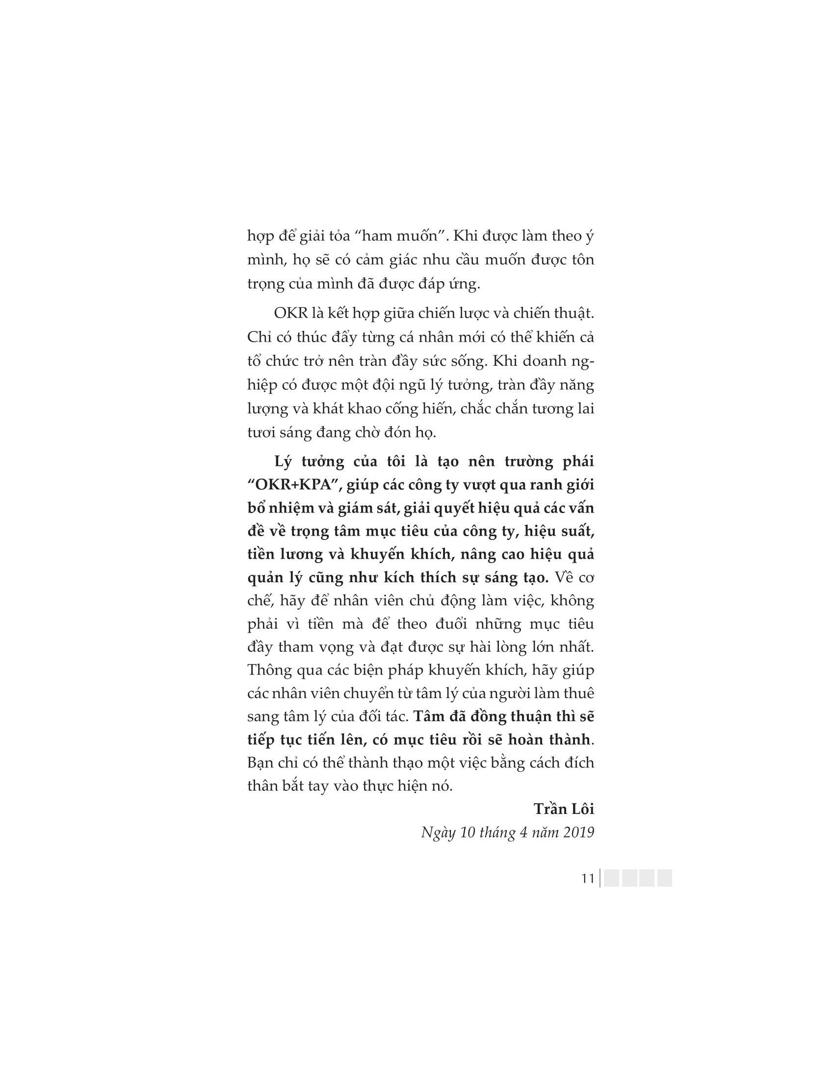 Là một cuốn giáo trình tổng quát, “OKR căn bản” sẽ cung cấp giải pháp cho những vấn đề thường gặp trong quá trình triển khai OKR. Cuốn sách sẽ giúp bạn thiết lập và phân tích mục tiêu hiệu quả, thực hiện OKR và cách thức để các nhà quản lý ở mọi cấp có thể lãnh đạo nhóm của m.ình, giao tiếp hiệu quả cả trong nội bộ lẫn với các đối tác bên ngoài, cũng như động viên và đánh giá từng cá nhân, qua đó đạt được hiệu quả cao nhất trong công tác quản lý.