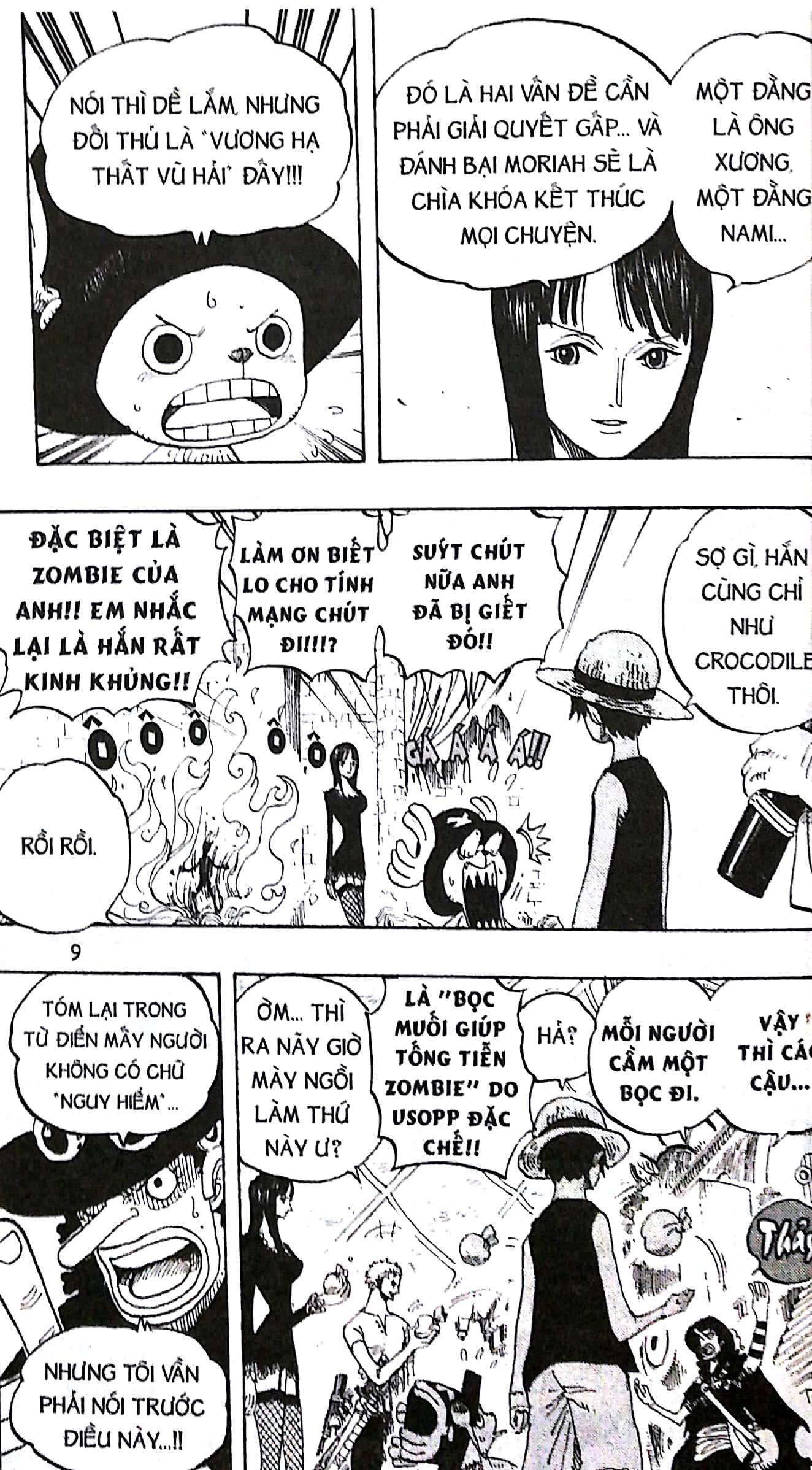 Vì muốn đoạt lại cái bóng từ tay Moriah trước bình minh mà nhóm của Luffy lại một lần nữa tiến vào Thriller Bark. Nào ngờ họ đã bị 4 tên quái nhân - Binh đoàn Zombie - cùng ma nhân Oars có được cái bóng của Luffy chặn lại!