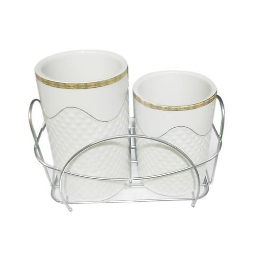 ✨Ống đũa sứ đôi | ỐNG CẮM ĐŨA 2 CÓ THOÁT NƯỚC KHUNG KIM LOẠI | 2 HŨ SỨ ĐỰNG ĐŨA VÂN SẦN CAO CẤP VIỀN VÀNG
