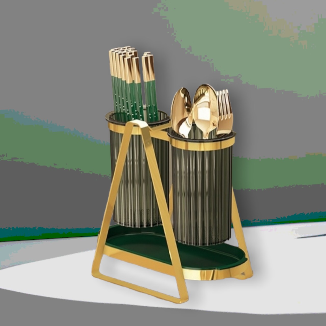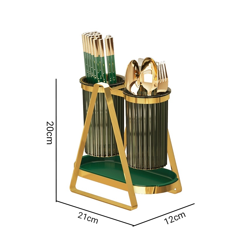bộ sản phẩm bao gồm chất liệu inox 304 mạ vàng / có khay hứng nước và 2 ống đựng đũa thìa màu xanh cổ vịt