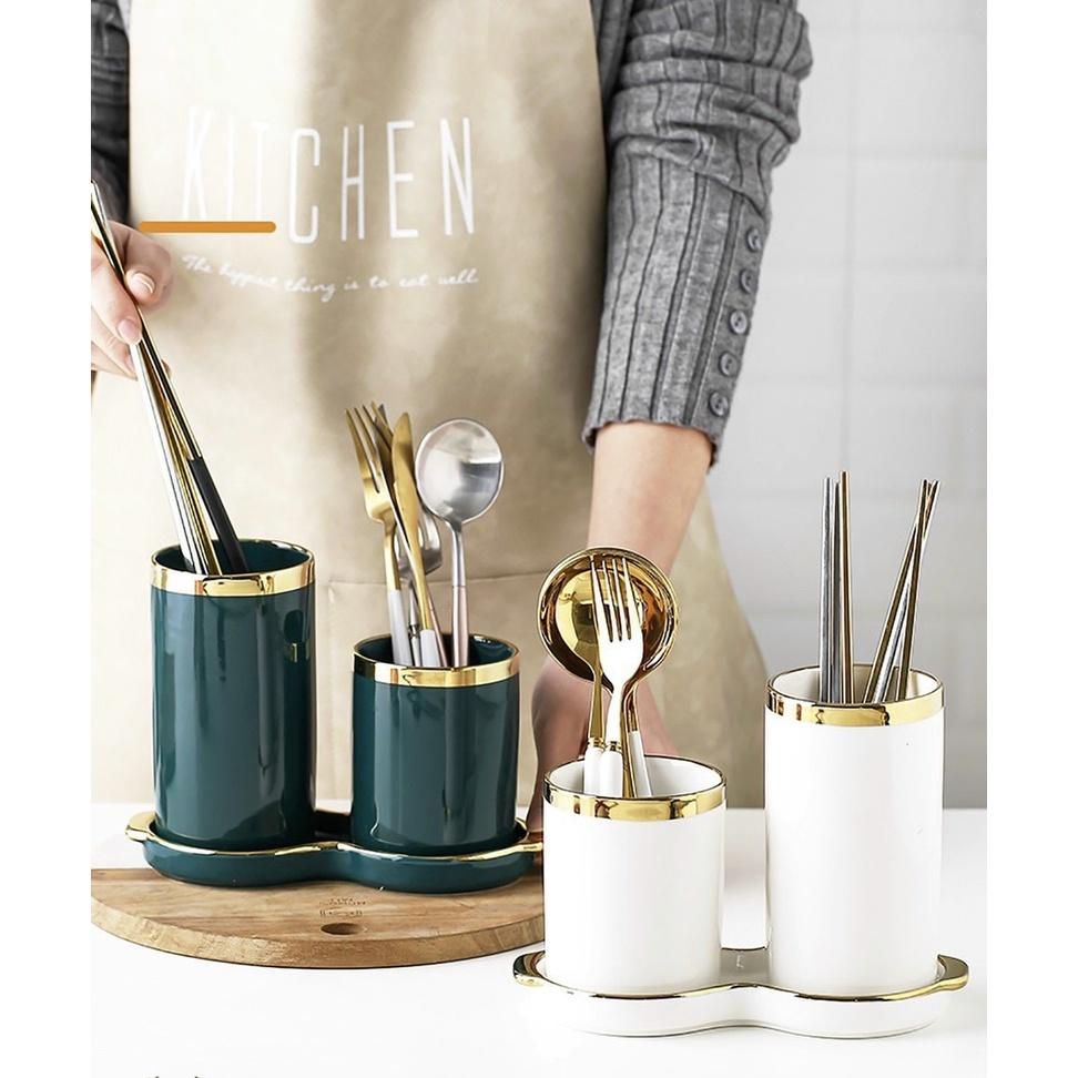✨ỐNG ĐỰNG THÌA ĐŨA ĐÔI KHÈM KHAY BẰNG SỨ VIỀN VÀNG PHONG CÁCH BẮC ÂU SANG TRỌNG