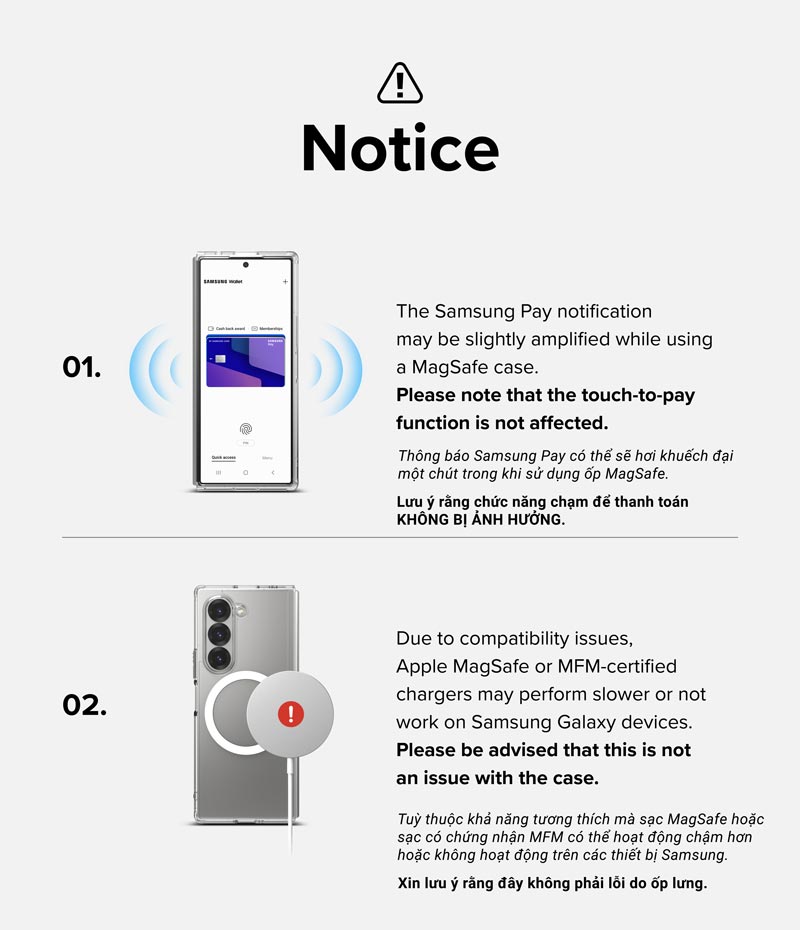 • Thông báo Samsung Pay có thể sẽ hơi khuếch đại một chút trong khi sử dụng ốp. Lưu ý: chức năng chạm-để-thanh-toán KHÔNG BỊ ẢNH HƯỞNG.