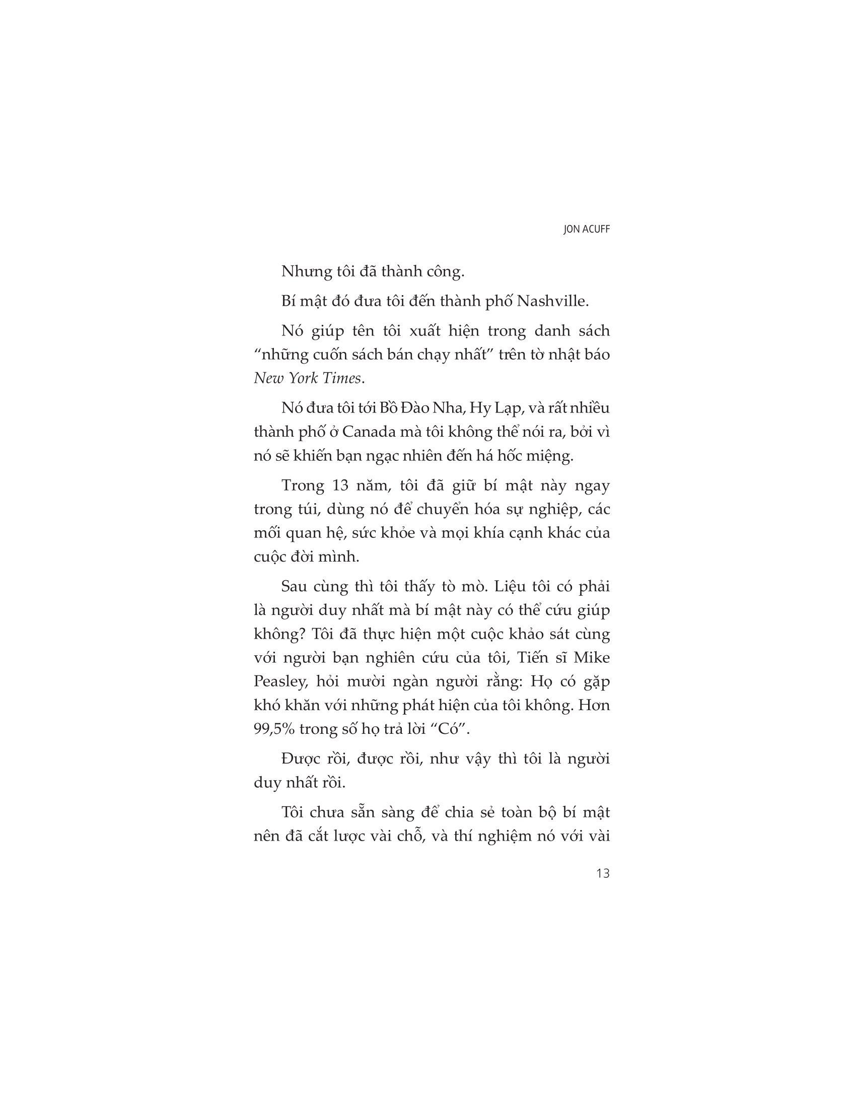 Overthinking - Kẻ Nghĩ Nhiều Đi cùng sự phát triển của xã hội, tất cả mọi người, đặc biệt là giới trẻ hiện nay gặp nhiều những vấn đề khác nhau trong cuộc sống, đặc biệt là những áp lực về tâm lý. Chúng ta thường mắc phải “căn bệnh Overthinking” - suy nghĩ nhiều về một sai lầm trong quá khứ và lo lắng thái quá về những chuyện ở tương lai. Suy nghĩ quá nhiều, về bản chất, diễn ra khi não của bạn xoay vòng quanh một ý nghĩ hay một ý kiến trong một thời gian dài, dài hơn mức cần thiết. Và điều không may là những suy nghĩ này thường có xu hướng trở nên mỗi lúc một tiêu cực. Overthinking là kẻ thù tệ hại nhất, giữ chân bạn trên con đường thực hiện những gì m.ình muốn. Nó là một trong những thứ đắt đỏ nhất trên đời, bởi vì, nó tiêu tốn công sức, làm lãng phí thời gian và cả sự sáng tạo. Đây chính xác là một loại dịch bệnh của việc dừng tiến lên, là cơn sóng thần của sự bế tắc. Với cuốn sách “Overthinking – Kẻ nghĩ nhiều”, bạn sẽ học được cách biến những suy nghĩ của m.ình thành hành động. Bạn có thể tận dụng thời gian, công sức và sự sáng tạo có thể tái tạo để tạo ra cuộc sống mà bạn muốn. Và nó bắt đầu bằng việc nhận ra bản chất của những suy nghĩ – là một bài hát của cuộc đời m.ình. Về tác giả: Jon Acuff được tạp chí Inc. Magazine vinh danh là 1 trong 100 diễn giả về quản lý, lãnh đạo nổi bật. Ông đã diễn thuyết ở nhiều quốc gia trên thế giới cho các tập đoàn lớn như Microsoft, Nissan, Walmart, FedEx, và Comedy Central. Lời khen dành cho cuốn sách: “Jon Acuff đã phát hiện ra chướng ngại cản trở chúng ta thành công và tạo ra một kế hoạch để vượt qua nó. Cho nên đừng suy nghĩ quá nhiều để quyết định. Hãy chọn ngay cuốn sách hài hước hữu ích này đi, và chuẩn bị giấy để ghi chú nhé”. Daniel , tác giả nổi tiếng của New York Times với cuốn sách When, Drive, và To Sell Is Human “Nếu bạn đã sẵn sàng thay đổi định hướng của cuộc đời, Jon Acuff ở đây để giúp bạn làm được điều đó. Đây là một cuốn sách đơn giản, có sức ảnh hưởng và hữu ích, nó là thứ bạn sẽ nhớ tới mỗi ngày trong suốt quãng đời còn lại”. Seth Godin, tác giả của Câu chuyện tiếp thị trong thời đại kỹ thuật số “Tôi không thể đếm hết số lần từng nói với các nhà lãnh đạo, ‘Anh đang suy nghĩ quá nhiều cho một quyết định’. Nó là kẻ thù tự nhiên của sự tập trung, và tôi rất mừng vì Jon Acuff đã không ngại gian khổ, nỗ lực hết m.ình để tìm ra cái nhìn mới về một chủ đề quan trọng như thế này”. Michael Hyatt, tác giả nổi tiếng của New York Times với cuốn The Vision Driven Leader