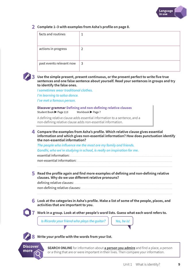Each unit presents students with a unit question, and five lesson questions, encouraging students to examine the world more critically within an inquiry-based learning environment. The Student Book also includes Vocabulary and Grammar reference and practice, Project lessons, Literature lessons, and a Writing workshop.