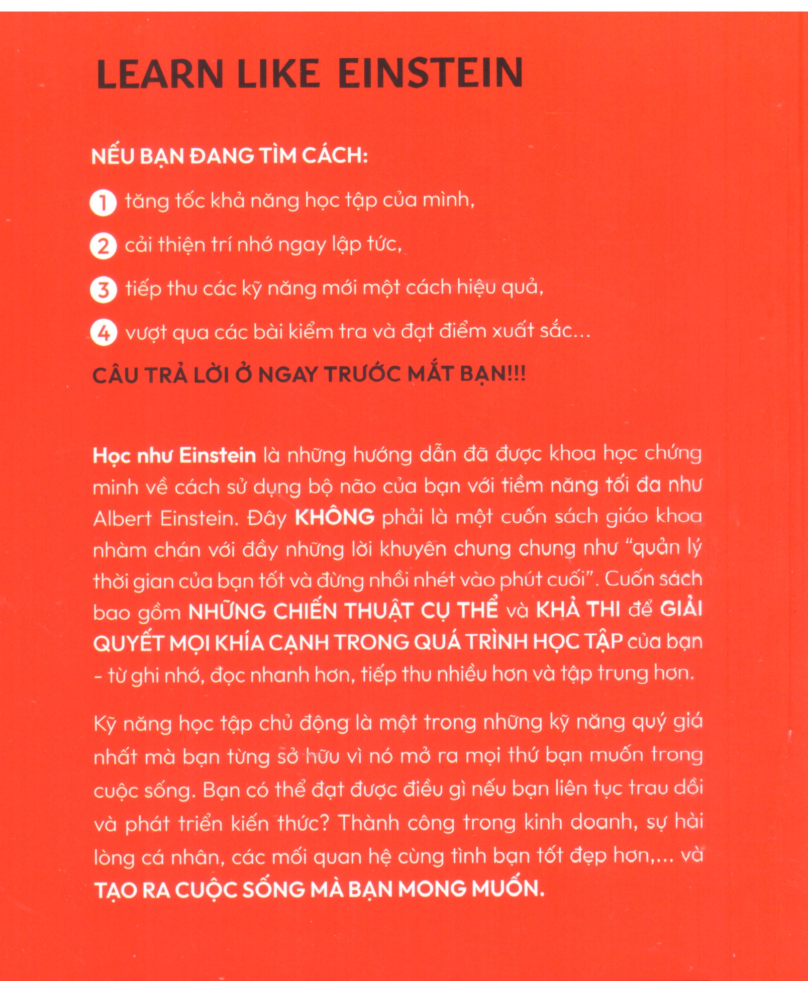 - Bí quyết thành công: Mở ra con đường ngắn nhất để bạn trở thành chuyên gia trong lĩnh vực mình theo đuổi. Học Như Einstein là cuốn sách không thể thiếu cho những ai muốn bứt phá và làm chủ con đường học tập và thành công của mình!
