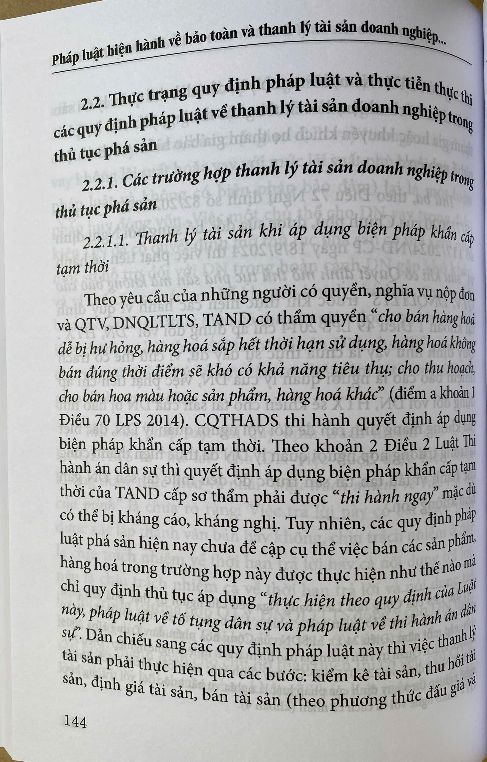 Mục tiêu của pháp luật phá sản hiện đại là kịp thời cung cấp cho doanh nghiệp mất khả năng thanh toán một công cụ để tăng khả năng phục hồi - đưa doanh nghiệp trở lại thương trường hoặc thanh lý tài sản doanh nghiệp để chi trả cho các nghĩa vụ ưu tiên trong trường hợp không thể tiếp tục duy trì hoạt động kinh doanh. Việc xây dựng hệ thống pháp luật phá sản linh hoạt, hướng tới hai mục tiêu trên là thực sự cần thiết trong giai đoạn hiện nay ở Việt Nam. Điều này sẽ giúp "thanh lọc" thị trường, góp phần nâng cao năng lực cạnh tranh quốc gia. Để làm được như vậy, trong quá trình tiến hành thủ tục phá sản, khâu bảo toàn và thanh lý tài sản của doanh nghiệp phải được thực hiện tốt.