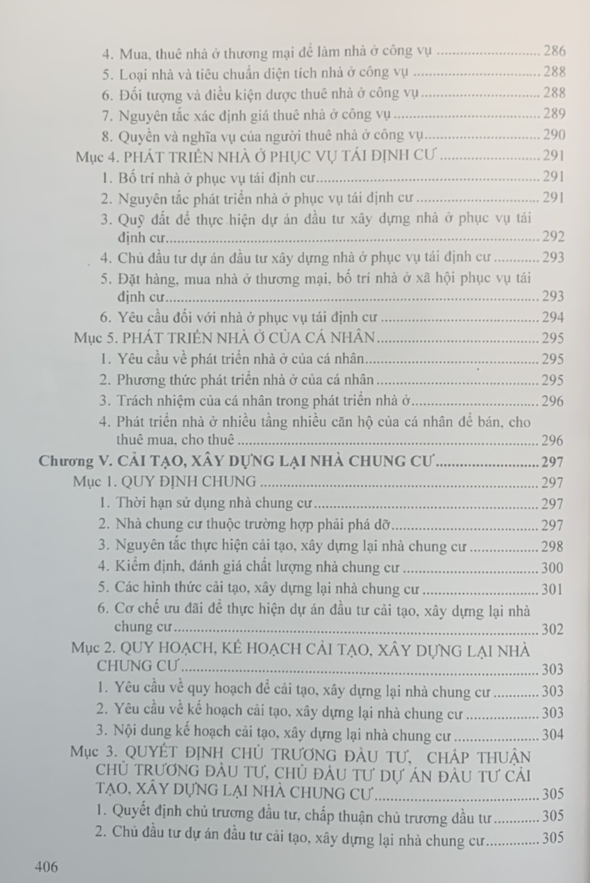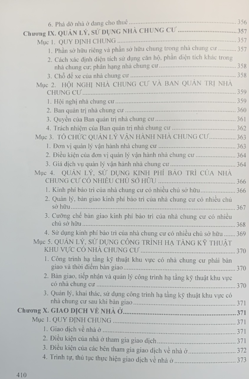 (Khái niệm chung về nhà ở; Sở hữu nhà ở; Chiến lược phát triển nhà ở quốc gia, chương trình, kế hoạch phát triển nhà ở cấp tỉnh; Phát triển nhà ở; Cải tạo, xây dựng lại nhà chung cư; Chính sách về nhà ở xã hội; Tài chính để phát triển nhà ở; Quản lý, sử dụng nhà ở; Quản lý, sử dụng nhà chung cư; Giao dịch về nhà ở