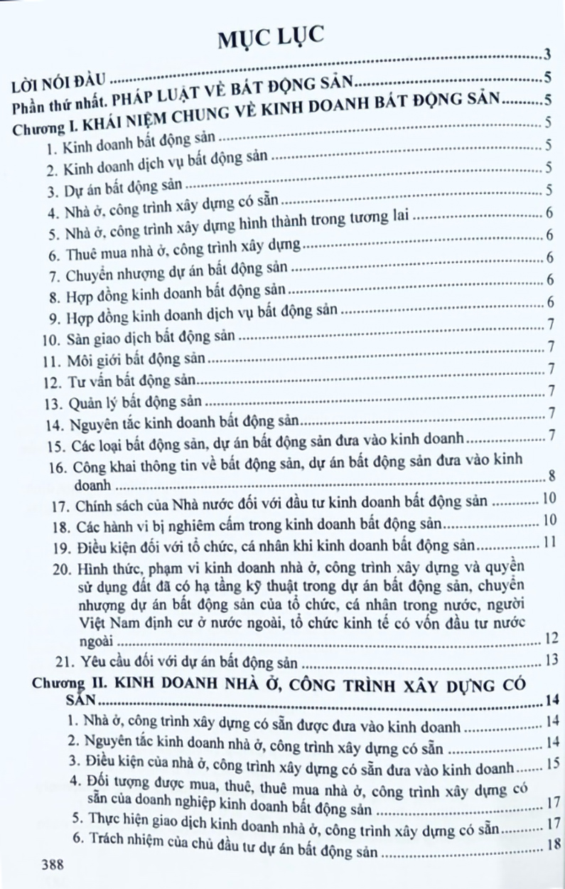 (Khái niệm chung về kinh doanh bất động sản; Kinh doanh nhà ở, công trình xây dựng có sẵn; Kinh doanh nhà ở, công trình xây dựng hình thành trong tương lai; Kinh doanh quyền sử dụng đất đã có hạ tầng kỹ thuật trong dự án bất động sản; Chuyển nhượng dự án bất động sản; Hợp đồng kinh doanh bất động sản; Kinh doanh dịch vụ bất động sản và đào tạo, bồi dưỡng, cấp chứng chỉ hành nghề trong kinh doanh dịch vụ bất động sản; Xây dựng và quản lý hệ thống thông tin, cơ sở dữ liệu về nhà ở và thị trường bất động sản; Quản lý nhà nước về kinh doanh bất động sản