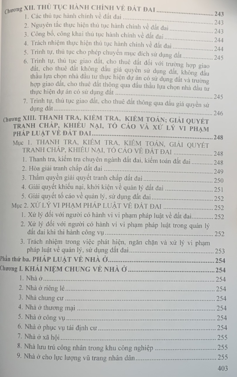 (Khái niệm chung về đất đai; Quyền hạn và trách Nhiệm của nhà nước, quyền và nghĩa vụ của công dân đối với đất đai; Quyền và nghĩa vụ của người sử dụng đất; Quy hoạch, kế hoạch sử dụng đất; Thu hồi đất, trưng dụng đất; Bồi thường, hỗ trợ, tái định cư khi nhà nước thu hồi đất; Phát triển, quản lý và khai thác quỹ đất; Giao đất, cho thuê đất, chuyển mục đích sử dụng đất; Đăng ký đất đai, cấp giấy chứng nhận quyền sử dụng đất, quyền sở hữu tài sản gắn liền với đất; Tài chính về đất đai, giá đất; Chế độ sử dụng đất; Thủ tục hành chính về đất đai; Thanh tra, kiểm tra, kiểm toán; giải quyết tranh chấp, khiếu nại, tố cáo và xử lý vi phạm pháp luật về đất đai