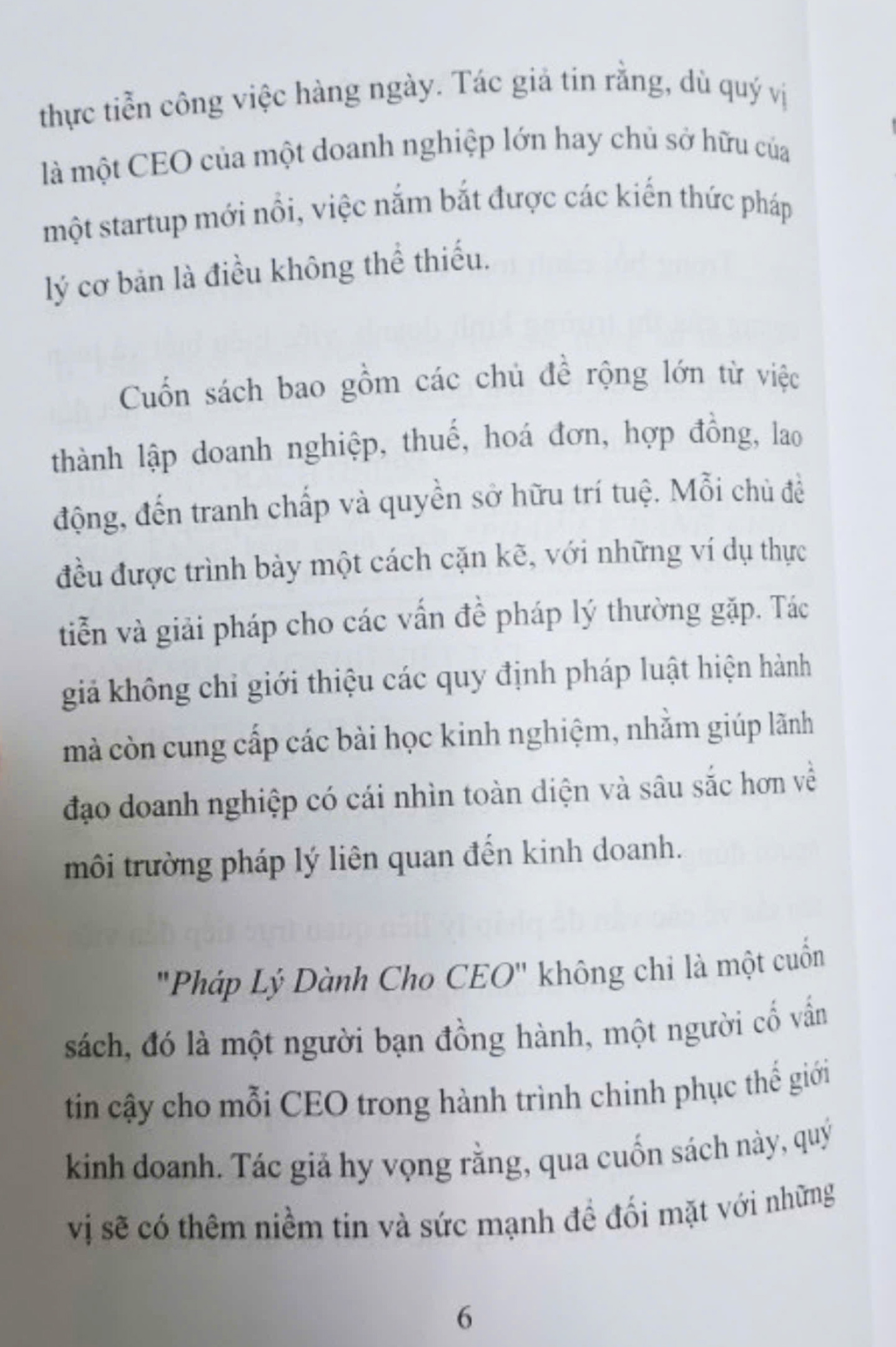 "Pháp Lý Dành Cho CEO" không chỉ là một cuốn sách, đó là một người bạn đồng hành, một người cố vấn tin cậy cho mỗi CEO trong hành trình chinh phục thế giới kinh doanh. Tác giả hy vọng rằng, qua cuốn sách này, quý vị sẽ có thêm niềm tin và sức mạnh để đối mặt với những thách thức pháp lý, từ đó dẫn dắt doanh nghiệp của mình vượt qua sóng gió, hướng tới thành công lâu dài và bền vững.