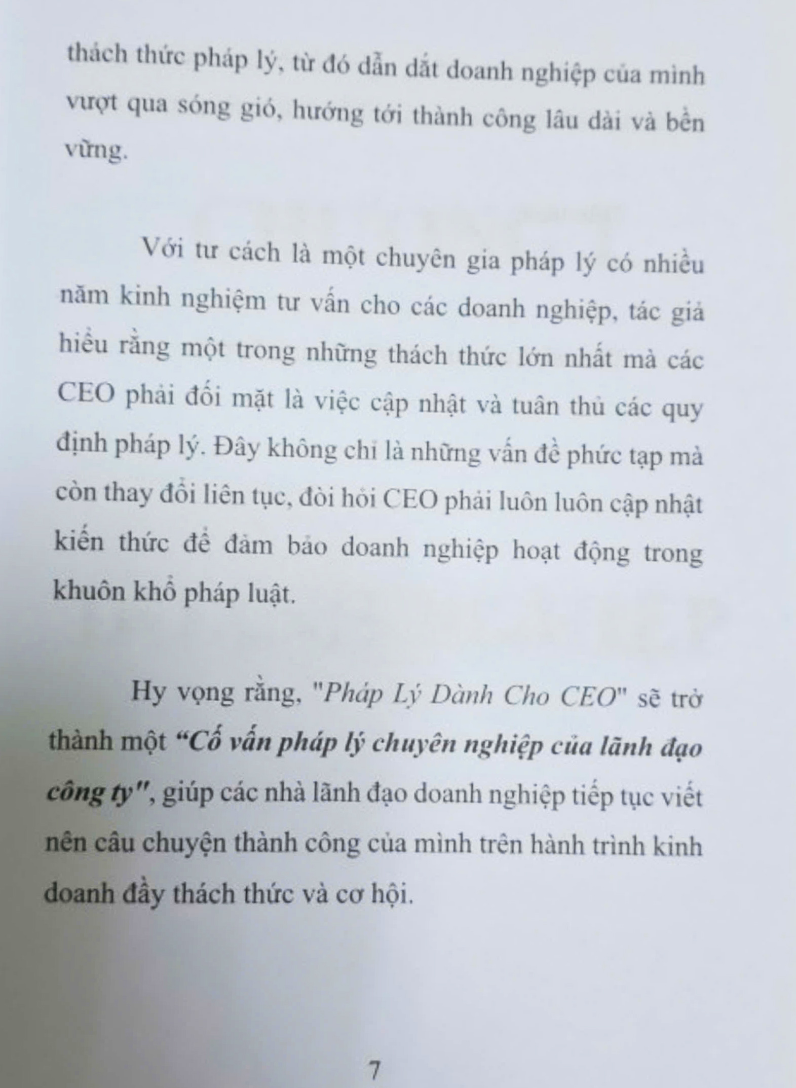 Với tư cách là một chuyên gia pháp lý có nhiều năm kinh nghiệm tư vấn cho các doanh nghiệp, tác giả hiểu rằng một trong những thách thức lớn nhất mà các CEO phải đối mặt là việc cập nhật và tuân thủ các quy định pháp lý. Đây không chỉ là những vấn đề phức tạp mà còn thay đổi liên tục, đòi hỏi CEO phải luôn luôn cập nhật kiến thức để đảm bảo doanh nghiệp hoạt động trong khuôn khổ pháp luật.