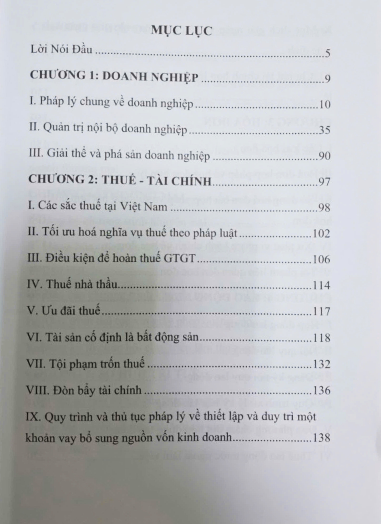 Cuốn sách bao gồm các chủ đề rộng lớn từ việc thành lập doanh nghiệp, thuế, hoá đơn, hợp đồng, lao động, đến tranh chấp và quyền sở hữu trí tuệ. Mỗi chủ đề đều được trình bày một cách cặn kẽ, với những ví dụ thực tiễn và giải pháp cho các vấn đề pháp lý thường gặp. Tác giả không chỉ giới thiệu các quy định pháp luật hiện hành mà còn cung cấp các bài học kinh nghiệm, nhằm giúp lãnh đạo doanh nghiệp có cái nhìn toàn diện và sâu sắc hơn về môi trường pháp lý liên quan đến kinh doanh.