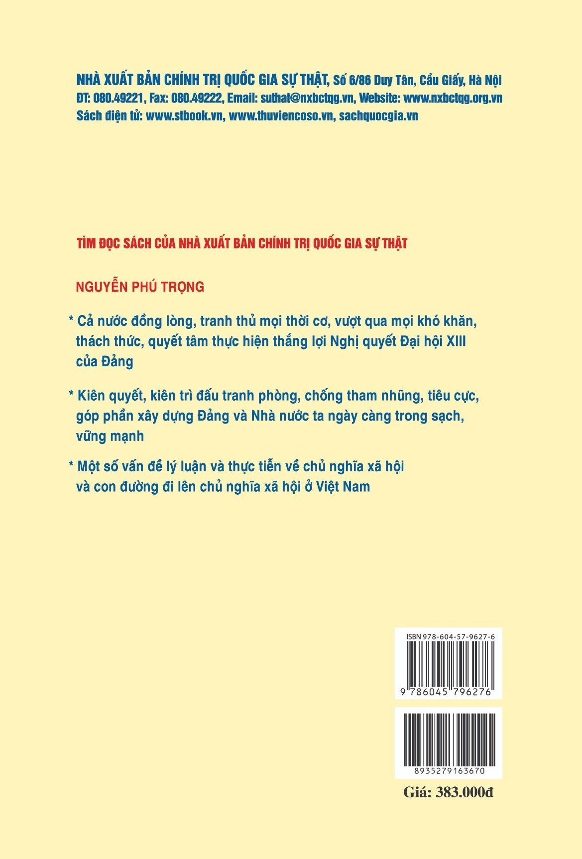 Cuốn sách tuyển chọn các bài nói, bài viết, bài phát biểu, trả lời phỏng vấn, thư, điệ của đồng chí Tổng Bí thư Nguyễn Phú Trọng, thể hiện tư tưởng nhất quán, xuyên suốt