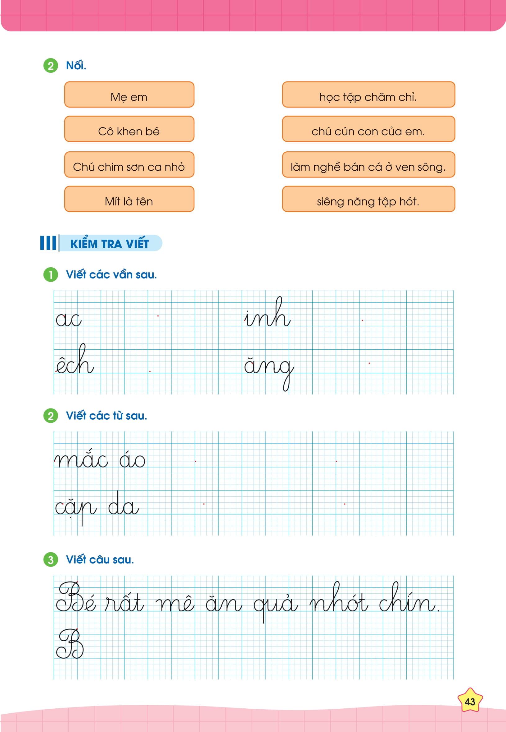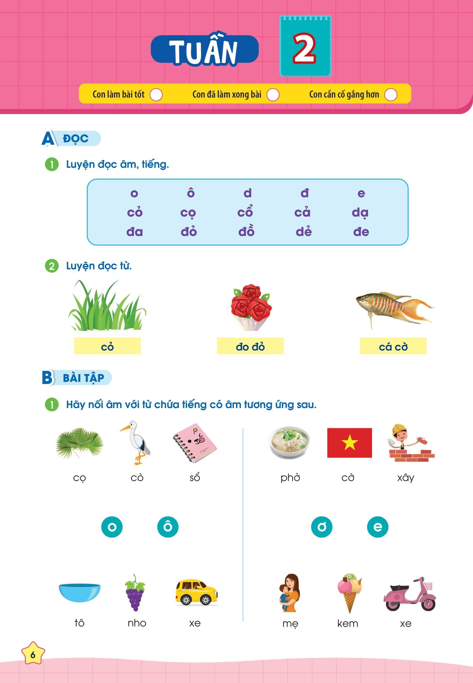 Phiếu bài tập cuối tuần Tiếng Việt 1 gồm các bài luyện tập chia theo tuần, ôn tập tổng quát kiến thức của 35 tuần học. Ngoài ra cuốn sách cũng cung cấp các bài kiểm tra giữa kỳ và cuối kỳ để các con trau dồi thêm, tự tin chinh phục điểm cao trong các bài kiểm tra trên lớp.