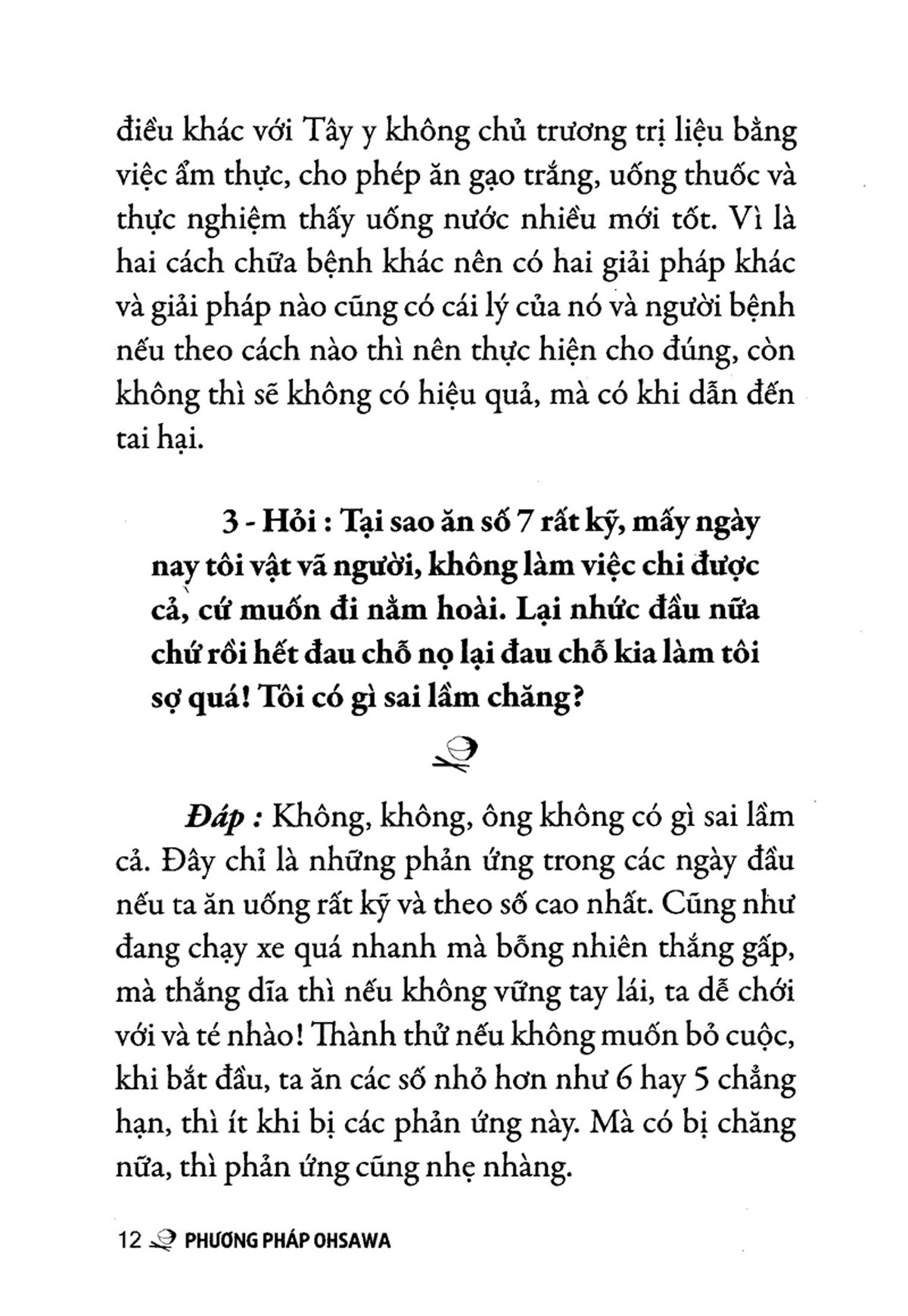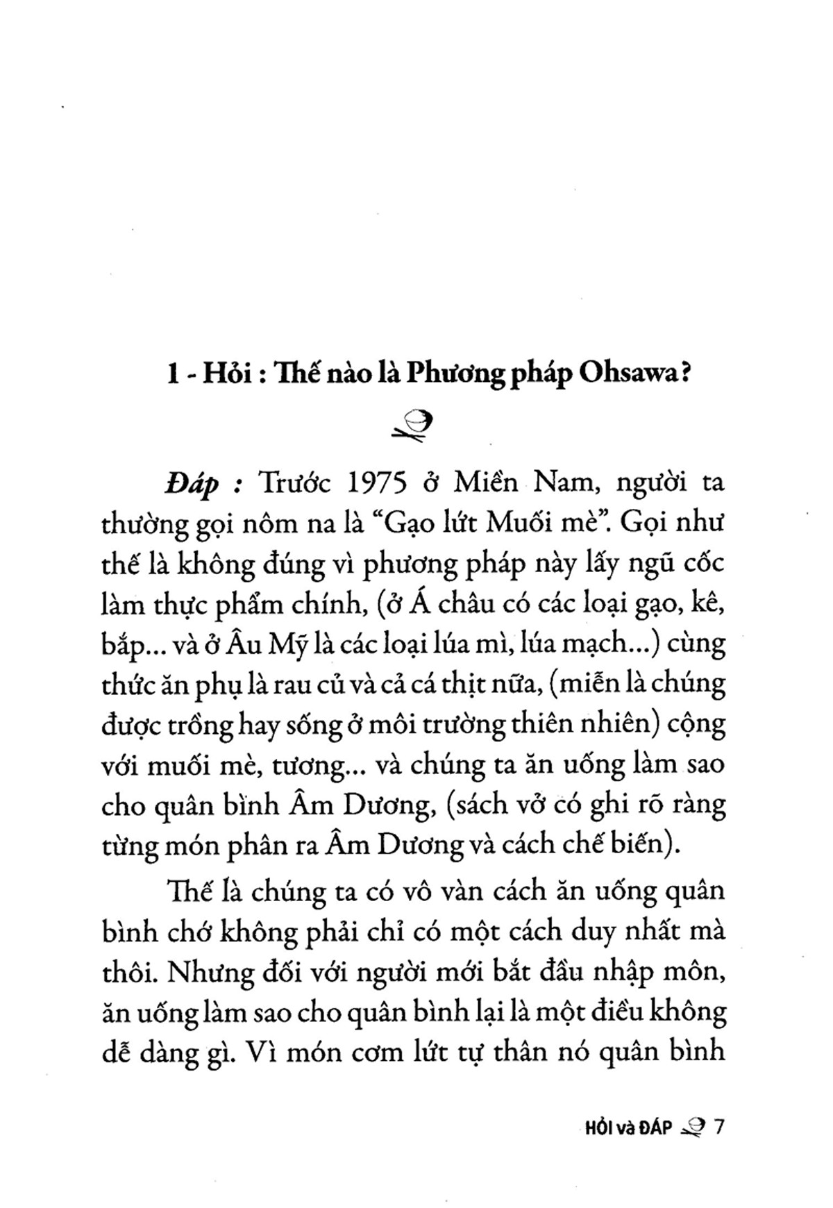 Phương Pháp Ohsawa - Hỏi Và Đáp tập 1 Mặc dù - phương pháp Ohsawa đã phổ biến hầu như khắp các nước trên thế giới trước 1964 đến mấy chục năm, thế mà mãi đến năm ấy, ở Miền Nam mới có một một bản dịch quyển Le Zen Macrobiotique của Tiên sinh. Rồi lần lượt ta thất nhiều quyển dịch khác phổ biến Phương pháp đơn giản mà kỳ diệu này cho đến ngày đất nước Niệt Nam được thống nhất vào năm 1975. Khoảng thời gian 11 năm đó hầu như mọi người ở Miền Nam đều biết Phương pháp Ohsawa qua các từ nôm na phổ thông là "gạo lứt muối mè".